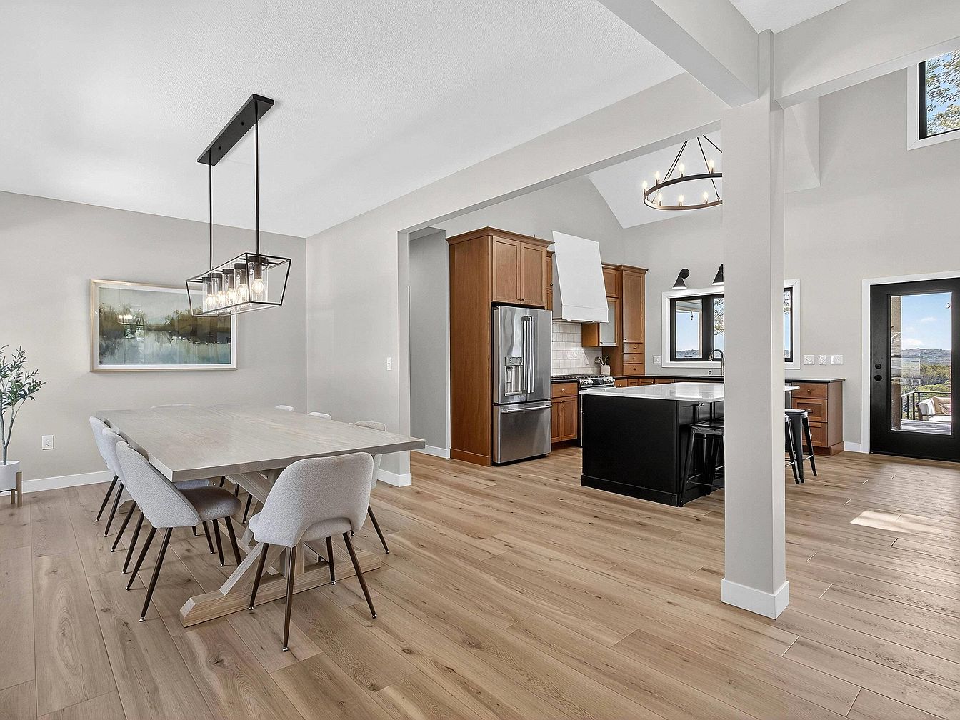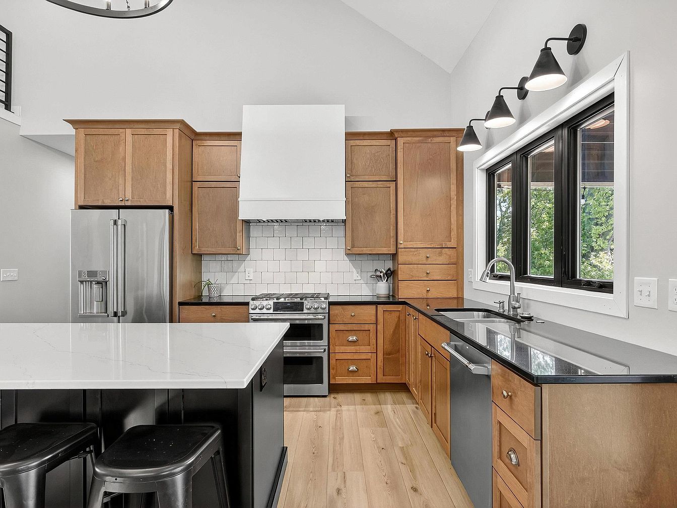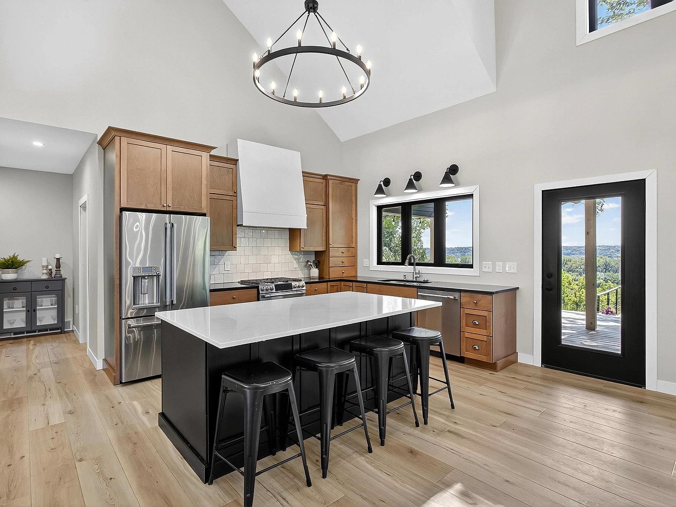 This kitchen features high ceilings and a bright, airy ambiance with light wood floors and soft gray walls. The centerpiece is a large, modern island with a sleek white countertop and black base, surrounded by four black metal stools. The cabinetry, finished in natural wood tones, provides warmth and contrast to the stainless steel refrigerator and gas range. Above the stove is a white vent hood, paired with white subway tile backsplash for a clean, classic touch. A wide window over the deep black countertop lets in natural light, while a glass-paned door opens to scenic outdoor views.