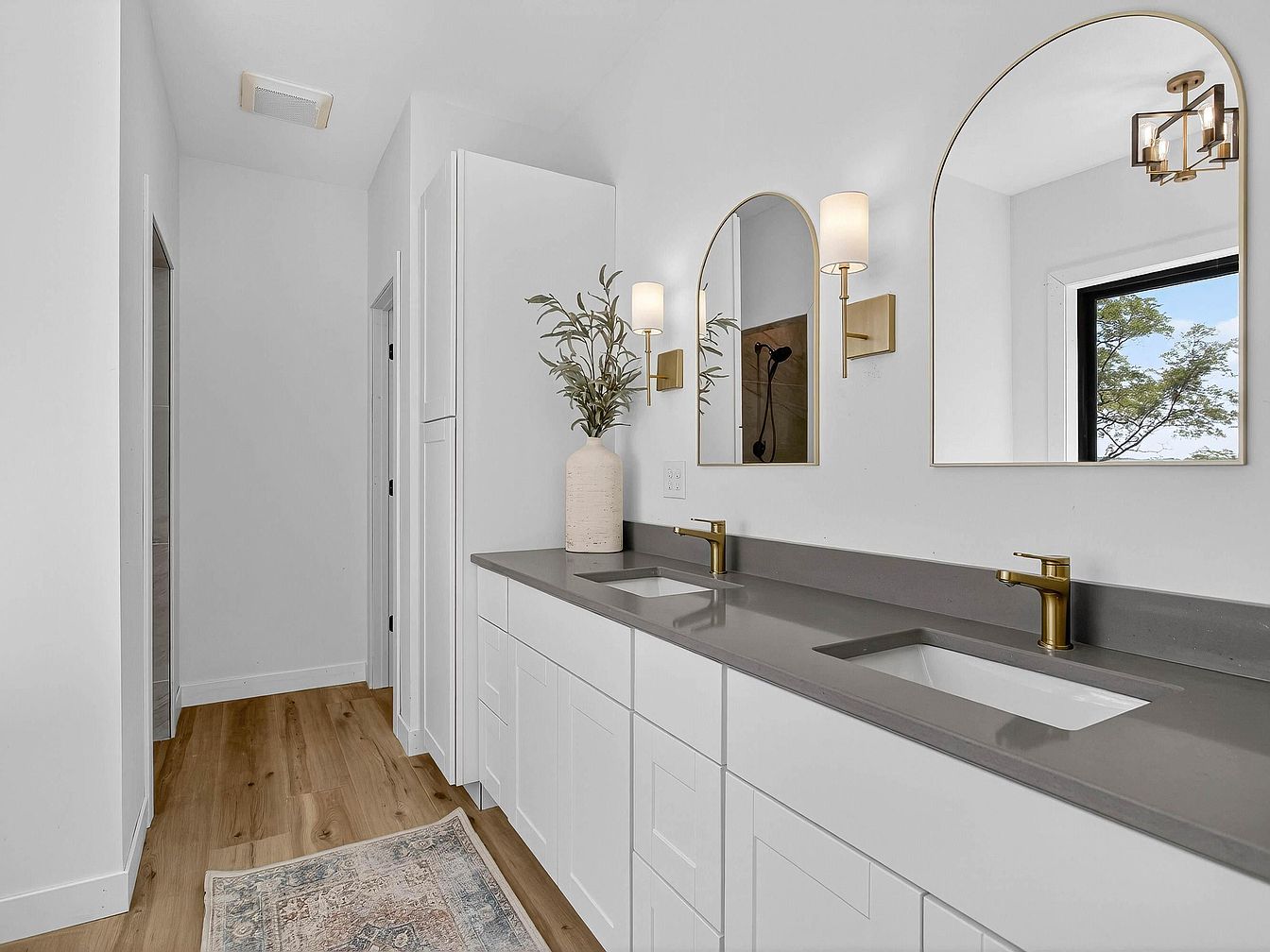 A sleek double-sink bathroom vanity with a contemporary style features a long gray countertop paired with minimalist white cabinetry below. Two brass faucets coordinate with matching brass-framed arched mirrors and elegant wall-mounted sconces. The floor is a light-toned wood, softened by a vintage-inspired area rug in muted tones. An oversized ceramic vase with greenery adds a touch of nature to the clean space. To the right, a large window framed in black lets in ample natural light, while to the left, a glimpse of a tiled shower is visible. The overall aesthetic is modern, airy, and understated yet inviting.