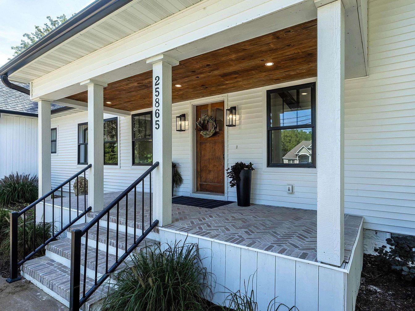 A covered front porch welcomes visitors with classic white siding and sturdy square columns, giving a timeless appeal. The ceiling above the porch features warm, natural wood panels with recessed lighting, creating a cozy atmosphere. Brick steps and herringbone-patterned brick flooring add texture and charm. A wooden front door stands out, accented by black iron railings and a modern lantern-style sconce. Black-framed windows provide contrast to the light exterior. Potted greenery and neatly landscaped beds with ornamental grasses line the walkway, completing the clean, inviting entrance to the home.