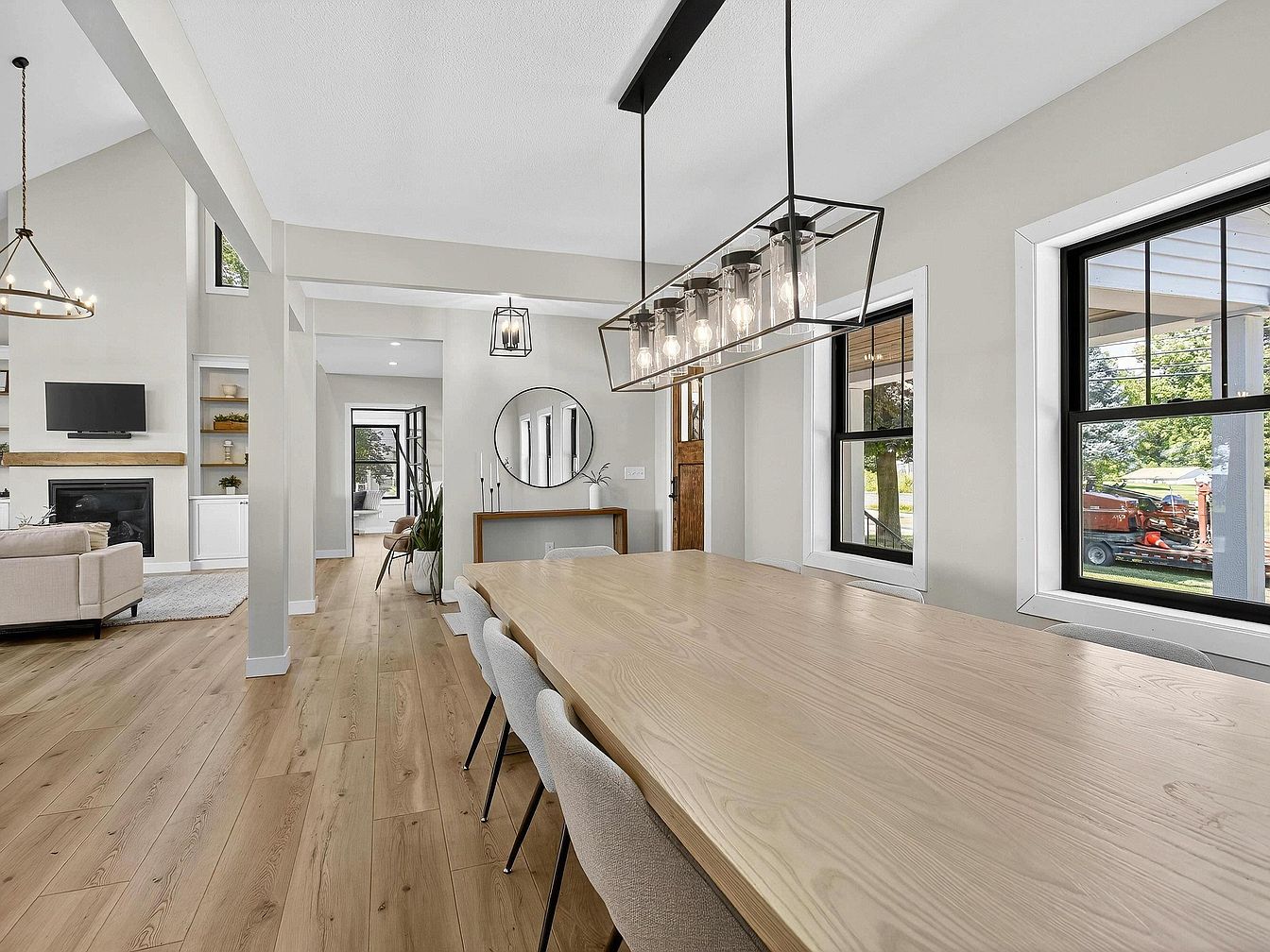 A long, light-colored wooden dining table anchors this open and airy space, surrounded by soft upholstered chairs in muted tones. Large windows with black trim let in abundant natural light, offering clear views outdoors and creating a bright and welcoming atmosphere. Over the table, a modern rectangular chandelier with exposed bulbs and a black frame makes a bold statement. The pale hardwood flooring and soft beige walls continue into the adjacent living room, where neutral-toned furniture, a fireplace with a wooden mantel, and built-in shelving add warmth. Clean lines and minimal decor give the space a fresh, contemporary feel.