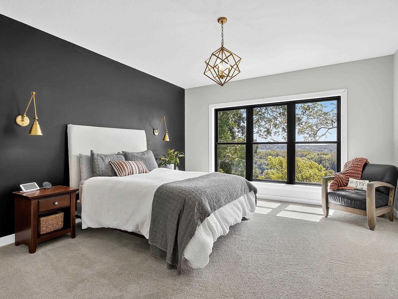 A serene bedroom featuring a large picture window with black trim that frames a sweeping view of trees and distant hills. The room has a minimalist, modern design with a striking matte black accent wall behind a queen-sized bed. The bed is dressed in crisp white linens with layered gray pillows and a charcoal quilt. Two gold wall sconces flank the headboard, adding a touch of sophistication. Beside the bed sits a dark wood nightstand with a woven basket below. A cozy armchair with a burnt orange knit throw and a small pillow is nestled to the side, creating a welcoming reading nook.