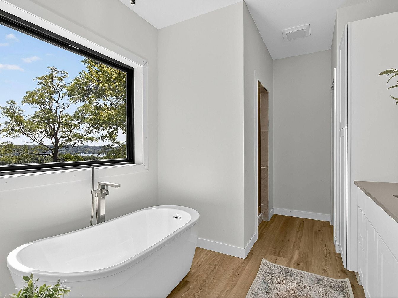 A bright bathroom with a freestanding white soaking tub positioned beneath a large rectangular window that frames a scenic view of green trees and a river or lake in the distance. Light gray walls create an airy atmosphere, complemented by pale wood floors that add warmth. A modern chrome faucet stands beside the tub. The right side features sleek, white cabinetry with minimalist paneling and a taupe countertop. A small, patterned rug lies on the floor in front of the sink area. Touches of greenery from small plants enhance the fresh, calming aesthetic of this serene space.