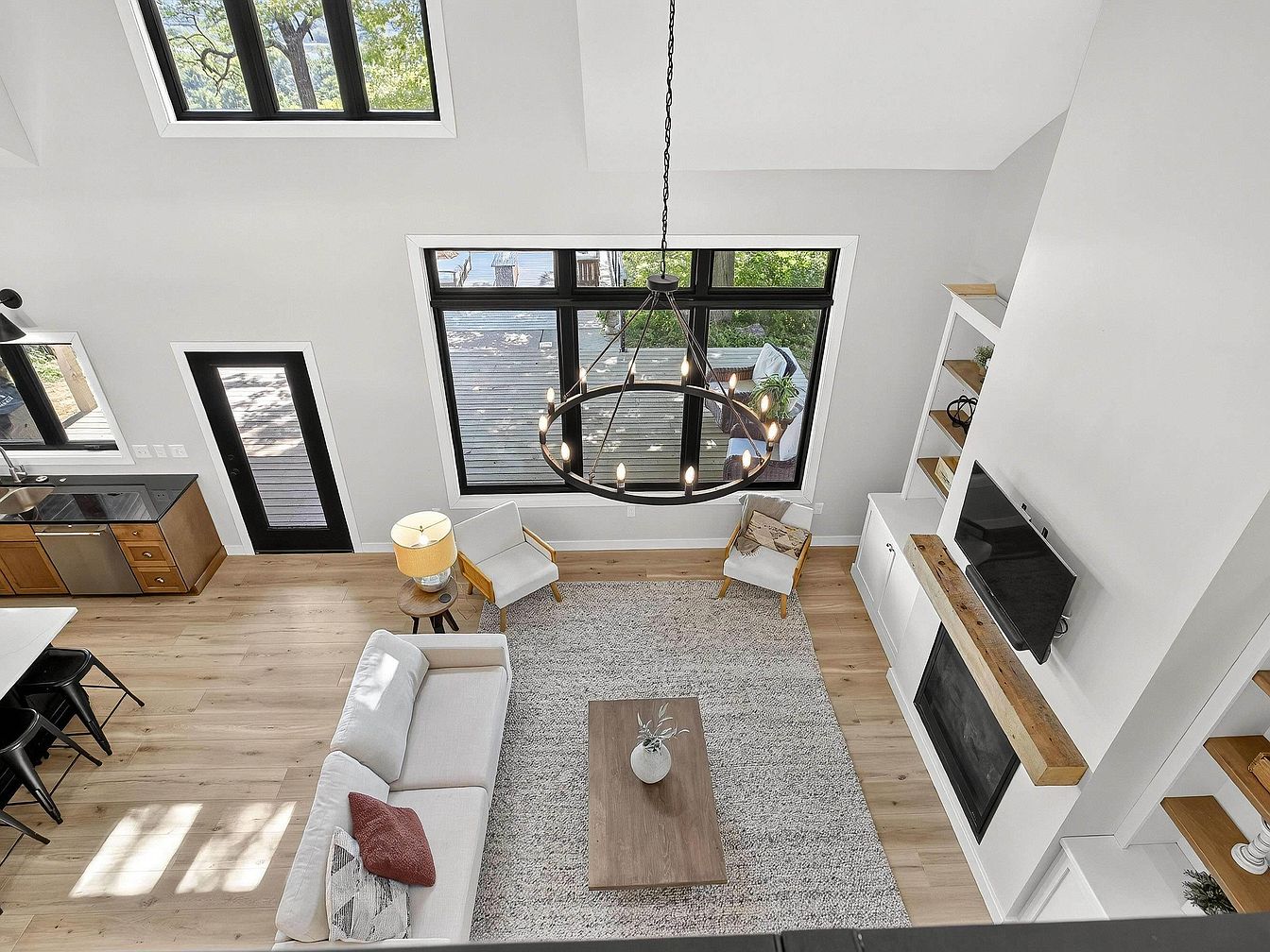 Looking down into a bright, modern living room with a double-height ceiling, the space is defined by large black-trimmed windows that let in natural light and frame views of trees and a deck outside. A light gray sectional sofa sits atop a textured area rug, paired with a wooden coffee table featuring a small vase and greenery. Nearby, a padded accent chair with wooden arms and a small round lamp table provide a cozy reading nook. The fireplace is framed in white with rustic wooden mantels and shelving, above which a flat-screen TV is mounted. Pale wood floors run throughout creating an airy and inviting atmosphere.