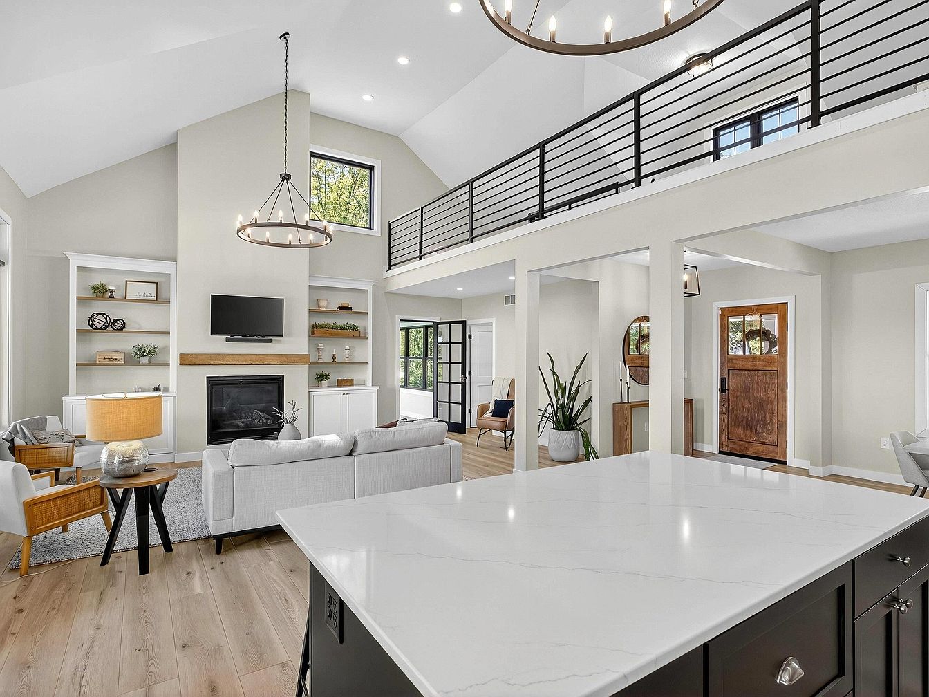 A spacious living area features vaulted ceilings and a modern open-plan layout. The color scheme uses soft beige walls contrasted by white trim and black accents, seen in the metal stair railing and chandelier. Light wood floors flow throughout, complementing the neutral-toned furnishings, including a white sofa, sleek armchairs with wooden frames, and a round, wood-topped side table. Built-in shelving around the fireplace holds decorative objects and plants, while a large island with a polished marble countertop anchors the open kitchen in the foreground. Abundant natural light streams through large windows and the entry’s wooden door adds warmth to the modern aesthetic.