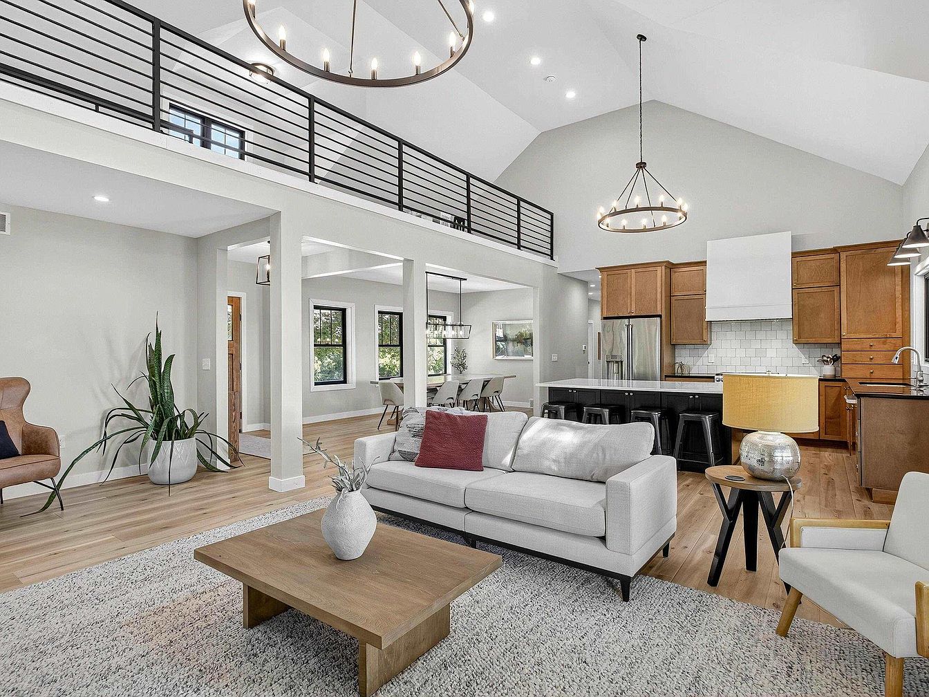 Spacious open-concept living area featuring vaulted ceilings and abundant natural light. A modern, airy aesthetic is achieved through neutral wall tones and light wood flooring. The sitting area centers around a low-profile wooden coffee table atop a textured beige rug, surrounded by a white couch, accent chairs, and a sculptural potted plant. Overhead, contemporary iron chandeliers provide a striking focal point. The kitchen in back showcases wooden cabinetry, white subway tile backsplash, stainless appliances, and a black island with barstools. An open railing loft overlooks the space, while multiple windows lend views of greenery outside.