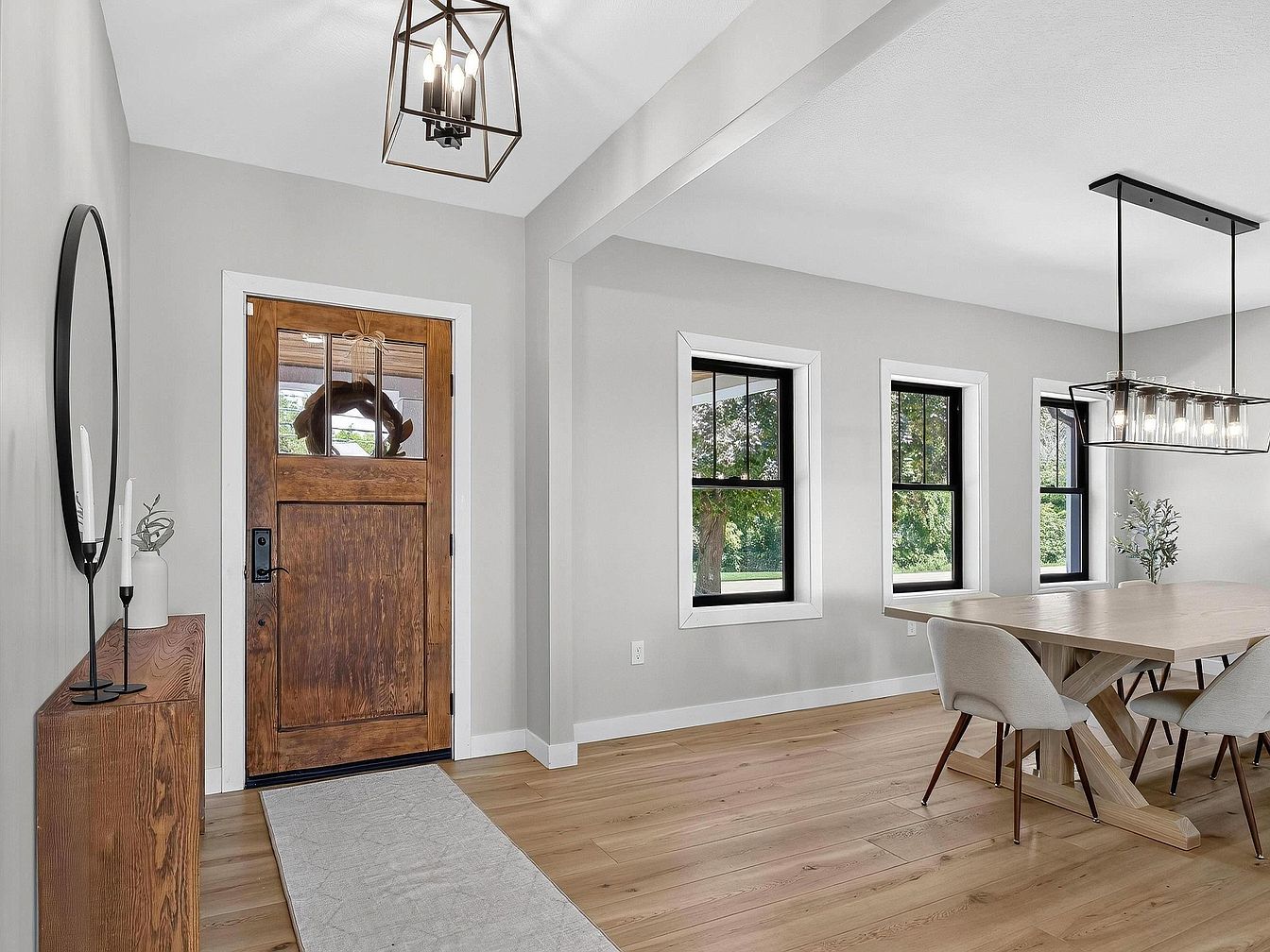 A welcoming front entry with a rustic wooden door, complemented by a slender wooden console table topped with minimalist decor, sets a warm tone. The adjacent dining area features a light wood table surrounded by six modern upholstered chairs with wooden legs, reinforcing a contemporary farmhouse style. Pale gray walls and three black-trimmed windows allow abundant natural light to brighten the space, with wide-plank light wood flooring unifying both areas. Two geometric pendant light fixtures—one above the door and one above the dining table—add visual interest and modern elegance to the overall clean, airy aesthetic.