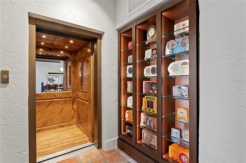 A well-lit hallway features a built-in home elevator with rich wood-paneled interiors and recessed ceiling lights, creating a cozy and sophisticated look. Adjacent to the elevator, a striking wooden display cabinet with glass shelves showcases a unique collection of vintage radios and clocks, adding a touch of nostalgia and personality. The floor is finished in earth-toned tiles, complementing the neutral textured walls. Thoughtful design ensures ease of movement for all ages, making the space accessible and family-friendly. The overall ambiance blends modern convenience with decorative charm, ideal for families seeking both style and practicality in their home.
