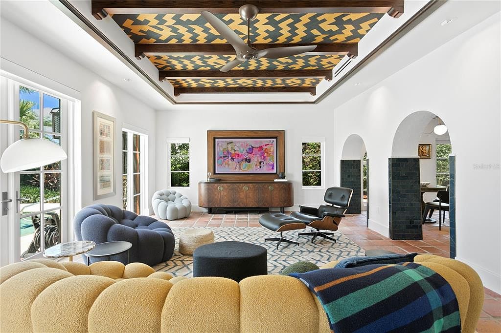A spacious, sunlit living room blending modern and mid-century design with family-friendly comfort. Large windows and glass doors fill the space with natural light, emphasizing crisp white walls and warm terracotta tile floors. Cozy, rounded couches in mustard yellow and navy offer ample seating for gatherings, accented by playful, sculptural lounge chairs. A patterned geometric ceiling with bold wood beams adds artistic flair above, while an eclectic area rug brings warmth and softness for playtime. An Eames lounge chair and ottoman complete the seating ensemble. Arched entryways lead to other rooms, providing an inviting, open flow ideal for families.