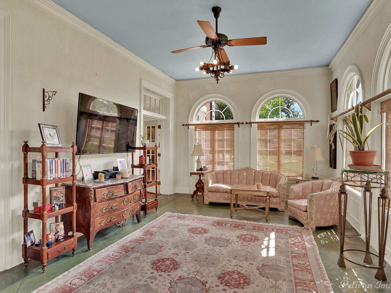 This cozy living room features a soft blue ceiling that complements the warm beige walls. A vintage wooden dresser is adorned with decorative items and a television mounted above it. Classic arched windows fill the space with natural light, framed by elegant blinds and flanking lamps. The seating area showcases blush-colored couches with ornate detailing, arranged around a small wooden coffee table. A patterned area rug adds warmth to the green-toned flooring, while a potted plant subtly enhances the decor. Architectural moldings enrich the room’s character, creating an inviting atmosphere for relaxation and gatherings.