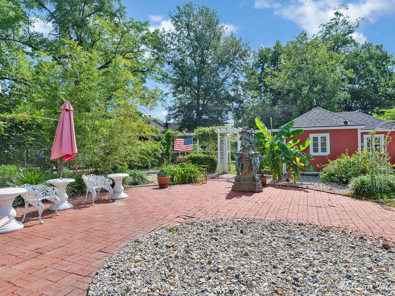 A spacious garden patio features vibrant landscaping, with lush green plants and trees providing a natural backdrop. The red brick pathway leads to white cast iron furniture, creating a charming seating area. A pink umbrella adds a splash of color, contrasting beautifully with the greenery. A decorative stone fountain stands prominently, surrounded by gravel, enhancing the tranquil atmosphere. In the background, a quaint red outbuilding with white trim and windows complements the rustic feel. Vibrant foliage, including banana plants and ornamental grasses, adds depth and texture, while a flag waving gently affirms a sense of home.