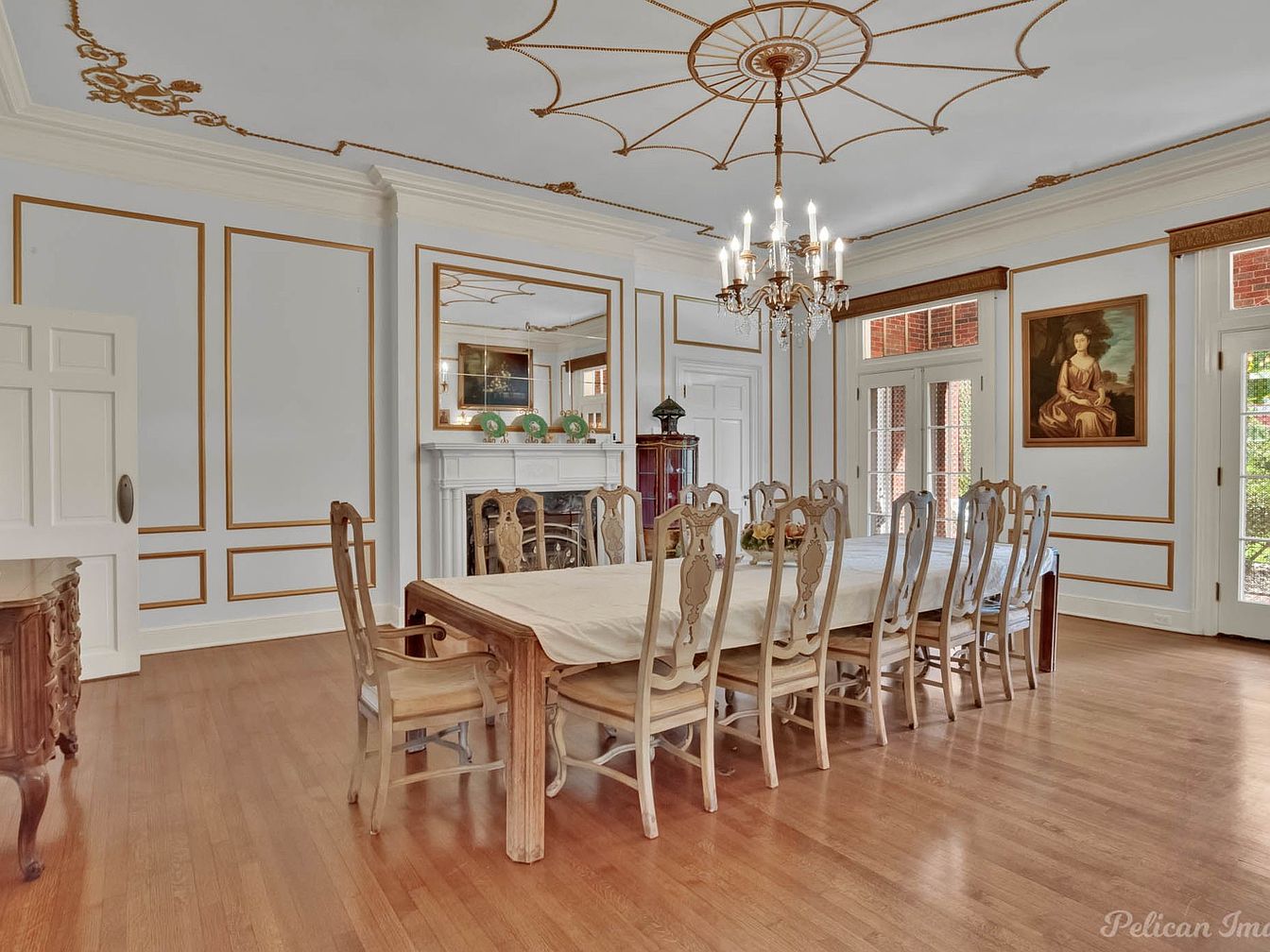 A spacious dining room features an elegant table set for ten, positioned under a magnificent chandelier that casts a warm glow. The walls are adorned with soft blue paint and intricate gold trim, creating a regal ambiance. Classic wooden chairs complement a rustic table, enhancing the room’s historic charm. A large mirror reflects light and adds depth, while a prominent fireplace with a marble facade serves as a focal point. Natural light floods in through expansive doors, showcasing a painted portrait that adds character. The warm hardwood floor adds warmth, tying together the sophisticated design elements.