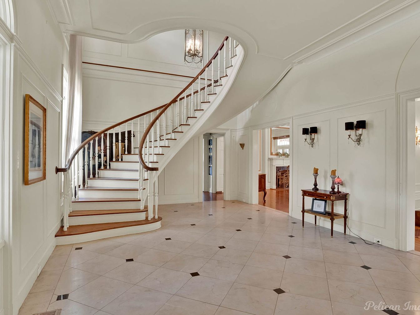 An elegant entryway features a sweeping curved staircase with a polished wooden handrail. The white walls are adorned with subtle wainscoting, enhancing the classic aesthetic. A large chandelier hangs gracefully from the ceiling, casting a warm glow. The floor is laid with large, light-colored tiles, interspersed with dark diamond accents, creating a sophisticated pattern. To the side, a slender table holds a small lamp and framed picture, while wall sconces provide additional lighting. Natural light streams through tall windows, illuminating the space and emphasizing its spacious, airy feel, perfect for welcoming guests.