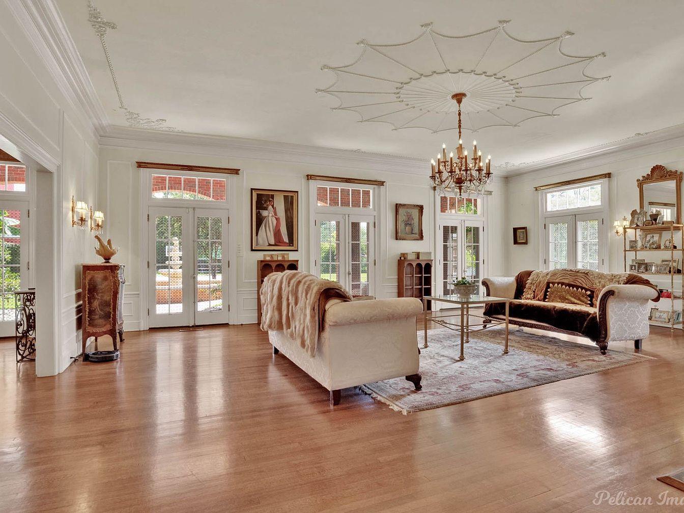 The living room features elegant furnishings with two ornate sofas, one adorned in rich browns and creams, creating a cozy and inviting atmosphere. A lavish area rug lies beneath a stylish glass coffee table, adding texture to the hardwood floor. The walls boast a soft pale hue, enhancing the vintage feel, highlighted by intricate crown molding. A grand chandelier hangs from the intricately designed ceiling, casting a warm glow. A beautifully framed mirror and decorative candelabras adorn the fireplace mantel, embodying classic elegance. French doors invite natural light, connecting to adjacent spaces and enhancing the room’s openness.