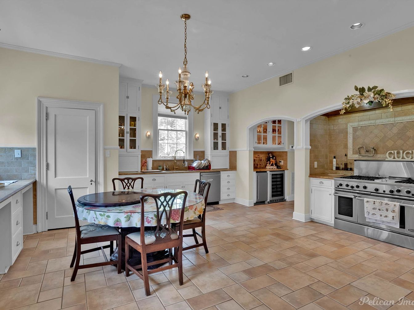 A spacious kitchen featuring a blend of modern and classic design elements. Warm beige walls enhance the overall warmth of the room, complemented by light-colored cabinetry with glass fronts that reveal decorative dishware. A circular wooden dining table with a floral tablecloth invites casual dining, surrounded by elegant wooden chairs. The floor is adorned with square beige tiles, adding texture and warmth. A stainless steel gas range, with intricate detailing, is prominent amidst a backsplash of muted stone tiles. A central chandelier casts a gentle glow, while natural light flows through large windows, creating a welcoming ambiance.