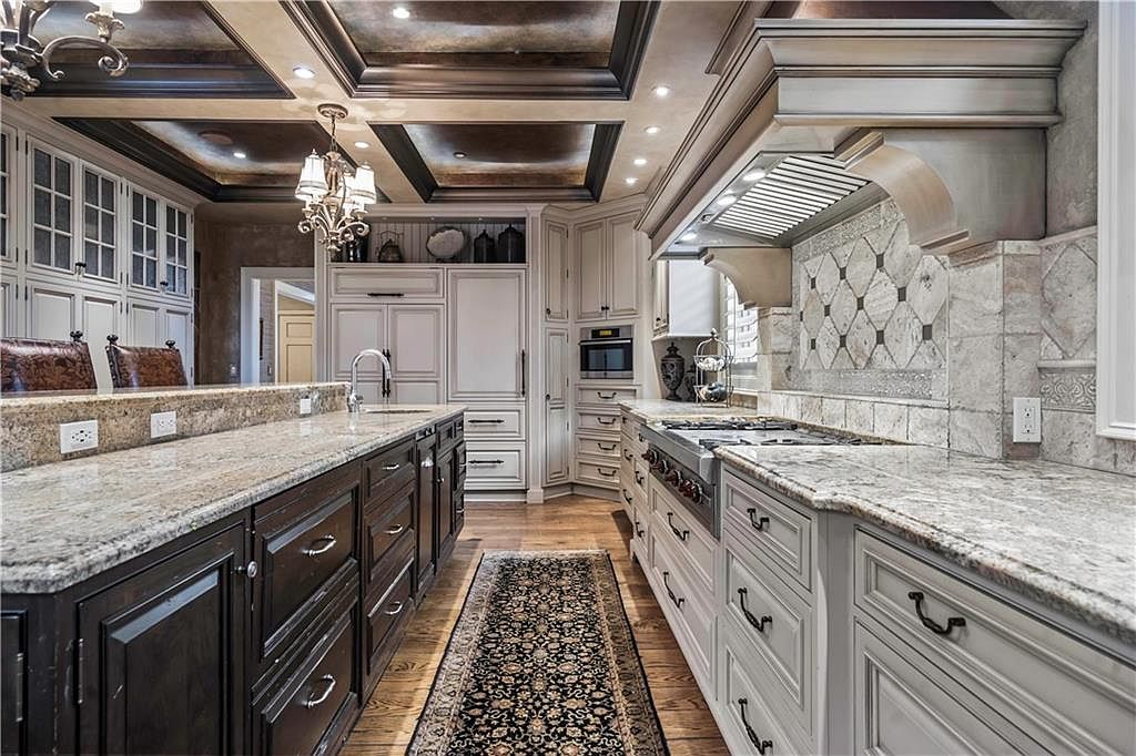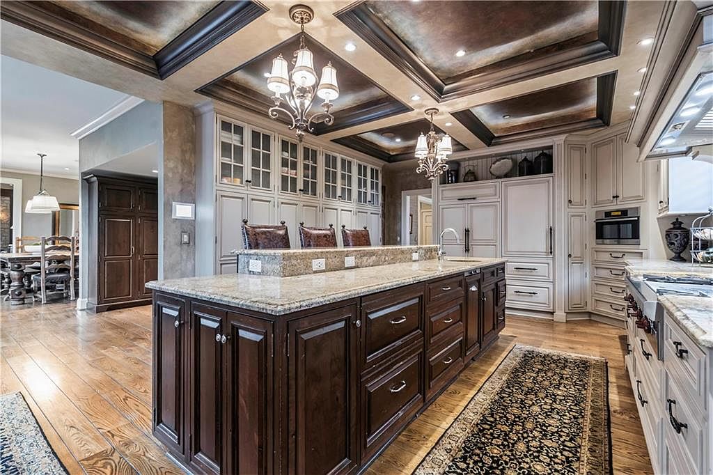 This kitchen showcases a harmonious blend of elegance and functionality. A wide, rich wooden island with dark cabinetry contrasts beautifully with the light granite countertops. The layout is spacious and inviting, featuring a muted color palette of creams and browns. The coffered ceiling enhances its charm, lined with recessed lighting and a stylish chandelier offering ambient illumination. Traditional cabinetry, adorned with decorative handles, is paired with a stunning backsplash of intricate tiles. Hardwood flooring adds warmth underfoot, and plush seating complements the dining space. This kitchen radiates sophistication, making it an ideal area for both cooking and entertaining.