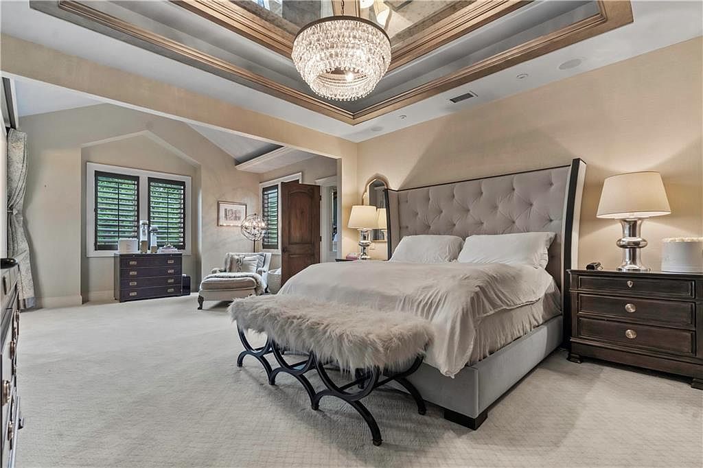 The spacious bedroom features a luxurious, tufted king-size bed with soft, white linens. Adjacent, a plush bench with a faux fur throw rests at the foot of the bed. A rich wooden nightstand, topped with a sleek lamp, complements a dark wood dresser adorned with elegant accents. Natural light floods through plantation-shuttered windows, casting gentle shadows on the creamy, textured walls and plush, neutral carpet. A stunning crystal chandelier hangs from a tray ceiling, emphasizing height and grandeur, while upholstered armchairs in the corner invite relaxation. Warm tones create a cozy, inviting atmosphere.