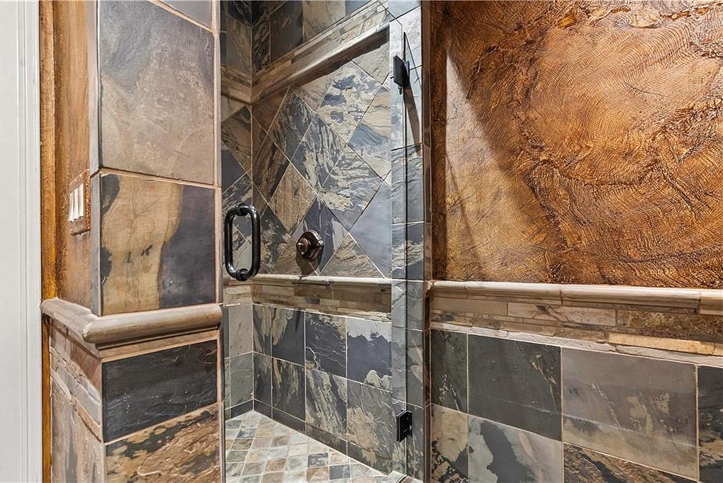 This shower area features an intricate design with a mix of textured stone tiles in earthy tones of gray, brown, and beige. The wall showcases a striking diagonal pattern created by the varying tile shapes and colors, enhancing the visual depth. A smooth, textured wall contrasts the tiled surfaces, adding a warm, organic feel. A glass shower door framed in black metal allows natural light to filter through, amplifying the space’s openness. The unique bronze fixtures, including a vintage-style water knob, complement the rustic aesthetic while maintaining functionality. This combination creates an inviting yet luxurious bathing experience.