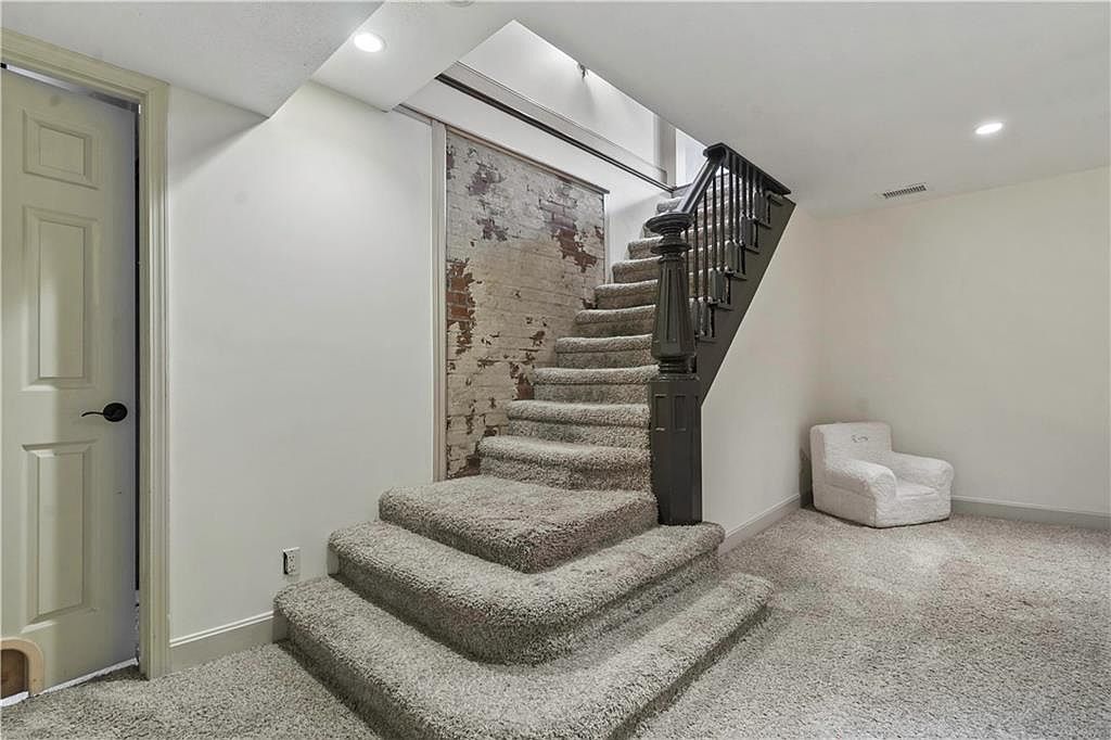 A cozy entry area featuring carpeted stairs that lead upwards, adding warmth to the space. The staircase is bordered by a black wooden railing, contrasting beautifully with the soft beige wall. Off to the left, a closed door adds a touch of privacy, while exposed brick on the right showcases rustic charm. Natural light filters in from above, illuminating the textured surfaces. At the base of the stairs, a plush white armchair invites relaxation. The overall color scheme is neutral, integrating soft tones and textures that create an inviting ambiance, perfect for welcoming guests into a home.