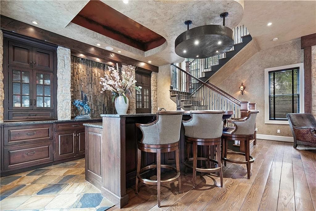 A sophisticated kitchen bar area showcases a rich blend of textures and materials. Dark wooden cabinetry with glass panels complements the rustic stone wall, adding depth. The granite countertop features a natural finish, enhancing durability and style. Stylish bar stools with woven fabric and dark natural wood frames create inviting seating. Above, a striking round pendant light hangs, contrasting with the earthy tones of the ceiling and stone accents. The warm hardwood flooring is highlighted by a mix of tonal tiles, while a glimpse of a staircase adds vertical interest, connecting the open space beautifully.