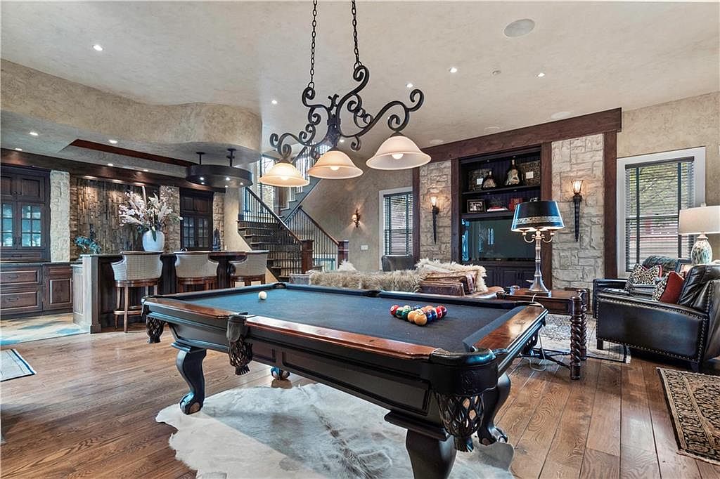 This space exudes a blend of sophistication and comfort, featuring a classic billiard table as the focal point. Rich wooden flooring complements the dark wooden cabinetry and stylish bar area, where high-backed stools invite social gatherings. A stunning chandelier hangs overhead, providing warm illumination along with well-placed wall sconces beside the large television. Textured stone walls add depth and character, while plush furnishings, including a leather sofa adorned with colorful pillows, enhance the inviting atmosphere. Natural light filters through window treatments, and decorative accents like a chic lamp and a large vase contribute to the room’s refined charm.