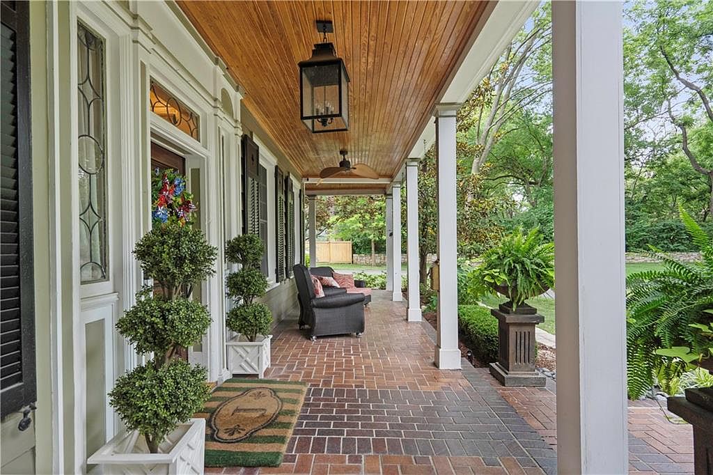 The front porch features a welcoming brick floor and wooden ceiling that highlights classic architectural details. Two topiary plants in white planters flank a cozy seating area, adorned with a striped pillow on a dark armchair. Decorative black shutters frame the windows, contrasting with the white columns and intricate molding. A rustic lantern hangs from the ceiling, providing a warm ambiance. A doormat featuring an inviting design adds a personal touch, while lush greenery surrounding the porch enriches the natural aesthetics, creating a perfect blend of comfort and charm in this historic home’s entryway.