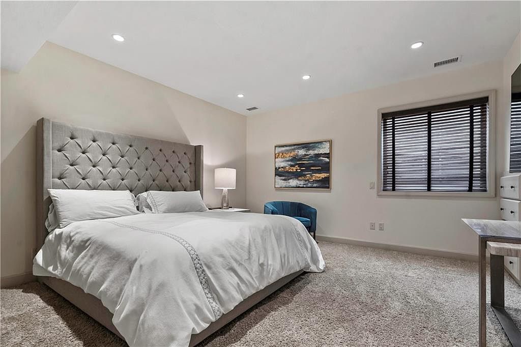 This spacious bedroom features a plush, tufted gray headboard that provides a sophisticated focal point. The color palette is soft and neutral, with white bedding complementing the subtle textures in the carpet. A modern floor lamp offers gentle lighting beside the bed, enhancing a cozy atmosphere. A vibrant piece of abstract art hangs on the wall, introducing an interesting contrast of colors. Natural light filters through the stylish blinds of a large window, creating a warm ambiance. In the corner, a striking blue accent chair adds a pop of color, contributing to the room’s contemporary elegance.