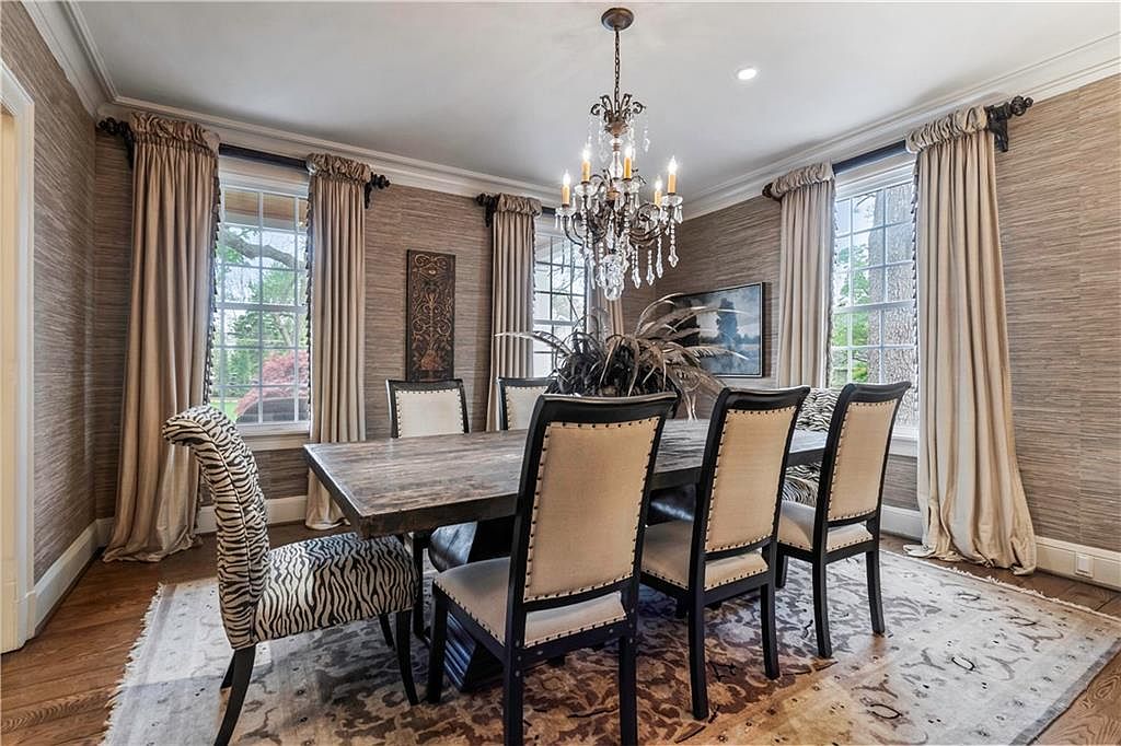 The dining room features a rustic wooden table surrounded by six upholstered chairs, showcasing a blend of elegance and warmth. The walls are adorned with a textured wallpaper, while large windows draped with light, flowing curtains allow natural light to flood the space. A striking chandelier hangs from the ceiling, reflecting a classic aesthetic with its crystal accents. In one corner, a piece of artwork adds sophistication, complemented by a decorative plant centerpiece. The flooring transitions seamlessly with a traditional area rug, unifying the cozy atmosphere and enhancing the room’s inviting charm.