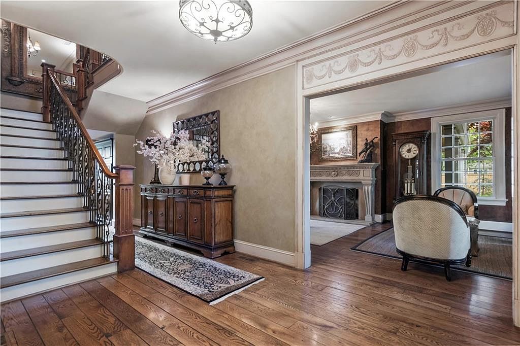 The entryway showcases an elegant interior with a grand staircase featuring dark wooden railings and white-painted stairs. Rich walnut flooring contrasts with muted beige walls, adorned with a delicate patterned crown molding. A vintage console table, flanked by decorative vases and a mirror, adds character and functionality. An intricate area rug lies beneath, enhancing the rustic charm. Beyond the entry, a cozy living area is visible, featuring a marble fireplace and classic furnishings, including a curved chair with soft upholstery. Natural light floods through window panes, highlighting inviting textures and warm tones throughout the space.
