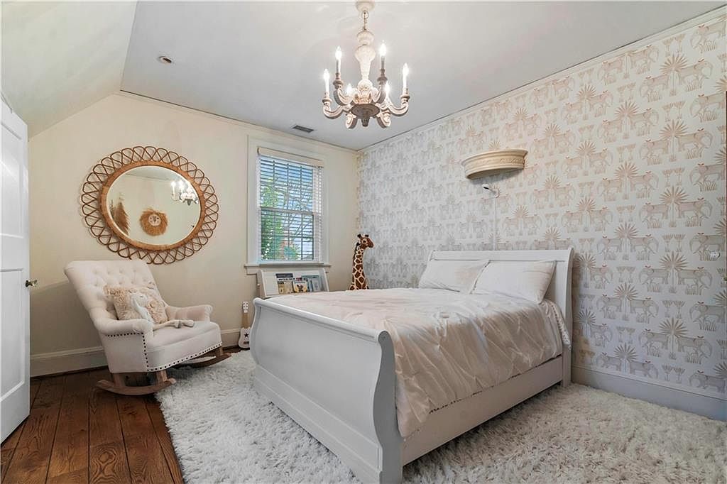 The bedroom features a serene atmosphere with soft, neutral tones dominating the color scheme. A plush, white, textured area rug lays beneath a classic white sleigh bed adorned with crisp linens. A vintage-style chandelier hangs from the ceiling, providing warm light. The wall behind the bed showcases whimsical wallpaper depicting delicate patterns, adding a playful touch. A round, woven mirror complements the decor, reflecting ambient light, while a cozy armchair sits in one corner, inviting relaxation. Large windows with white trim allow natural light to filter in, enhancing the room’s airy feel.