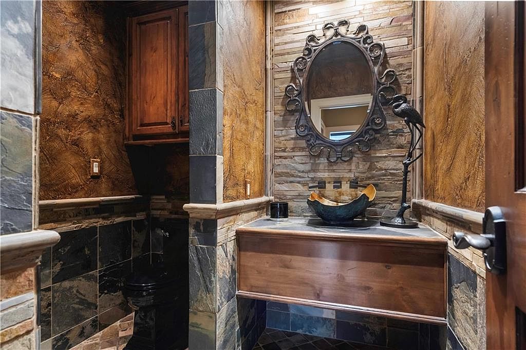The powder room features a sophisticated layout with rich textures and earthy tones. Walls are adorned with a combination of stone and artistic finishes, creating a warm ambiance. A stylish wooden cabinet contrasts with the dark slate flooring. In the center, a unique vessel sink made of dark material complements a decorative bowl. An ornate framed mirror enhances the visual appeal, while a delicate bird figurine adds charm. Subtle lighting fixtures provide soft illumination, highlighting the exquisite details. The use of natural elements and careful craftsmanship contributes to an inviting and elegant atmosphere.