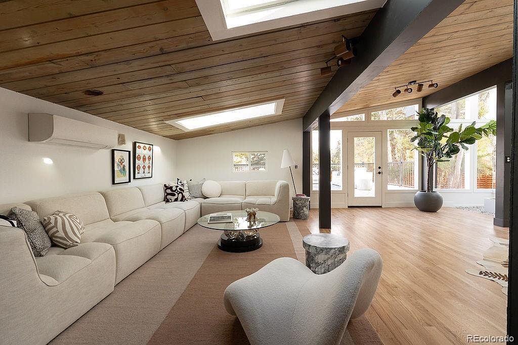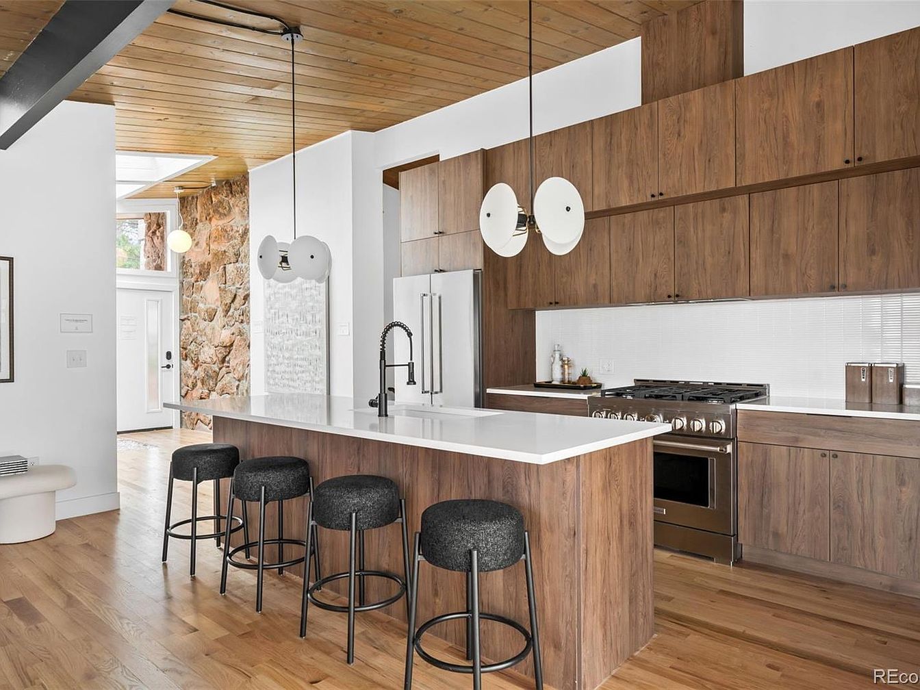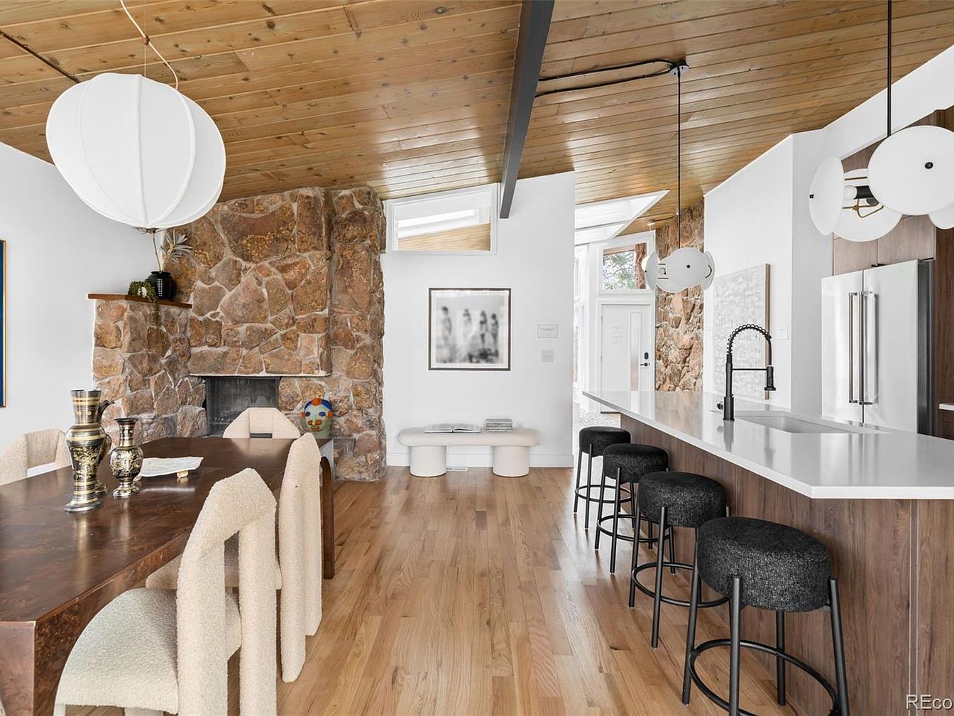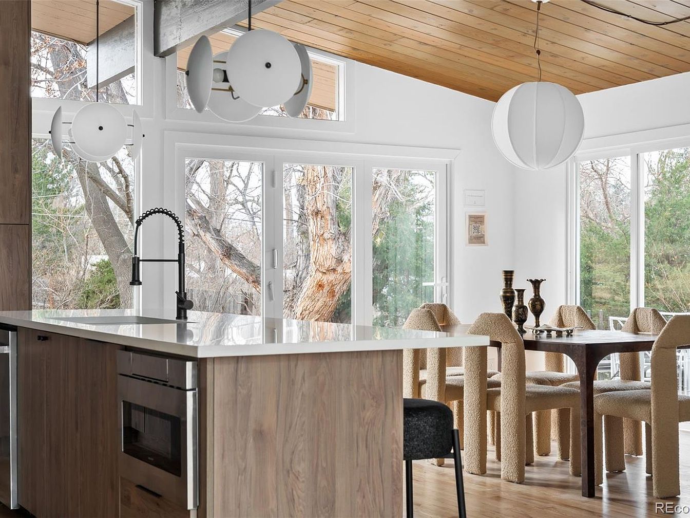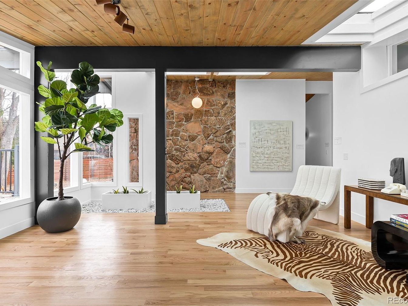 This fully remodeled Mid Century Modern ranch, located in Boulder, CO, offers a unique historical significance that reflects 20th-century architectural trends. Built around the mid-1900s, this home showcases trademark features including tongue-and-groove vaulted ceilings, an abundance of skylights, and stunning moss rock walls. Spanning nearly one acre, it is listed for $1,750,000 and boasts approximately 4,000 square feet of living space, with a total of four bedrooms plus an office. Recent renovations include a new septic system, roof replacement in 2024, and comprehensive HVAC upgrades. The outdoor area features mature trees and ample recreational space, perfect for gatherings. This property harmonizes nature and modern design, encapsulating Boulder’s vibrant lifestyle.