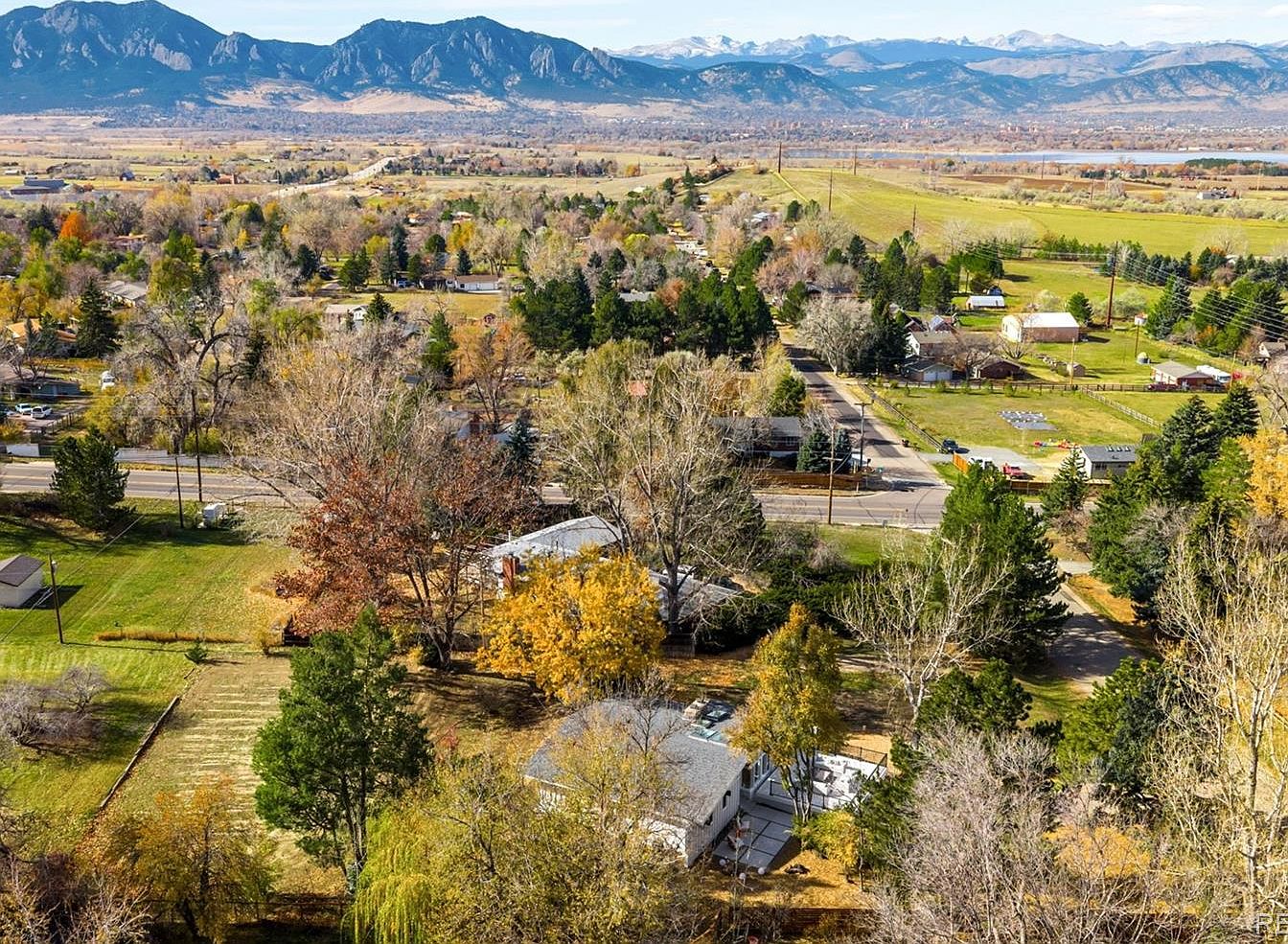 An expansive aerial perspective showcases the vibrant neighborhood set against a backdrop of majestic mountains. The landscape features a patchwork of lush green and golden trees, indicating the seasonal changes. Various homes are interspersed throughout, presenting a mix of architectural styles, primarily single-story, with varying rooflines. Streets weave through the greenery, with clear divisions between residential areas and open fields. The distant mountains add a dramatic flair, enhancing the natural beauty. The warm autumn colors intermingle with evergreen patches, creating a picturesque representation of suburban living amidst natural splendor.