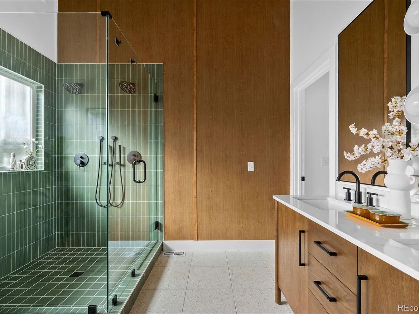 This modern bathroom features a spacious glass shower with green tile walls and a sleek floor. The tiles, in a subtle green hue, create a tranquil atmosphere, complemented by the polished chrome fixtures. A wooden accent wall adds warmth, contrasting with the light-colored, smooth countertop of the double vanity. The vanity is stylishly furnished with minimalist black hardware, blending functionality with aesthetics. A round mirror enhances the brightness, while a vase of white flowers accentuates the space. Natural light filters through a window, illuminating the room’s clean lines and contemporary design, embodying a serene and sophisticated retreat.