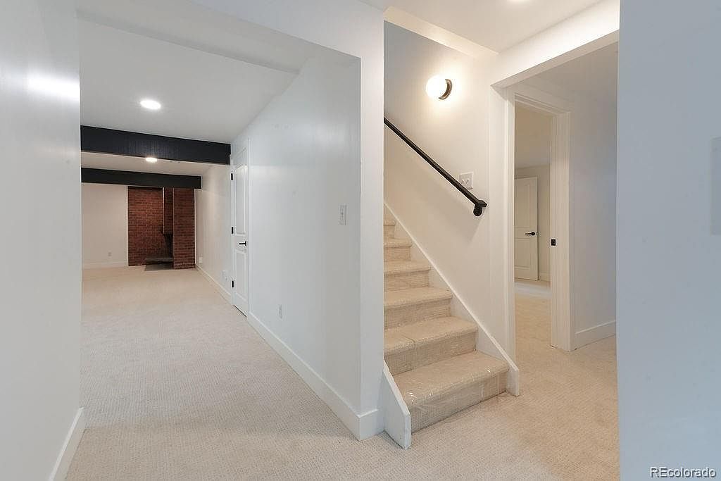 This hallway entry features a soft, neutral color palette with white walls and plush beige carpeting, creating a bright and welcoming atmosphere. To the left, a set of stairs leads upward, highlighted by a black metal handrail that adds a modern touch. A cozy nook at the far end showcases exposed brick, adding texture and warmth to the space. The lighting is bright, with a round fixture illuminating the stairway. Simple, clean lines and minimalistic design elements enhance the sense of spaciousness, making it an inviting transition between the areas of the home.