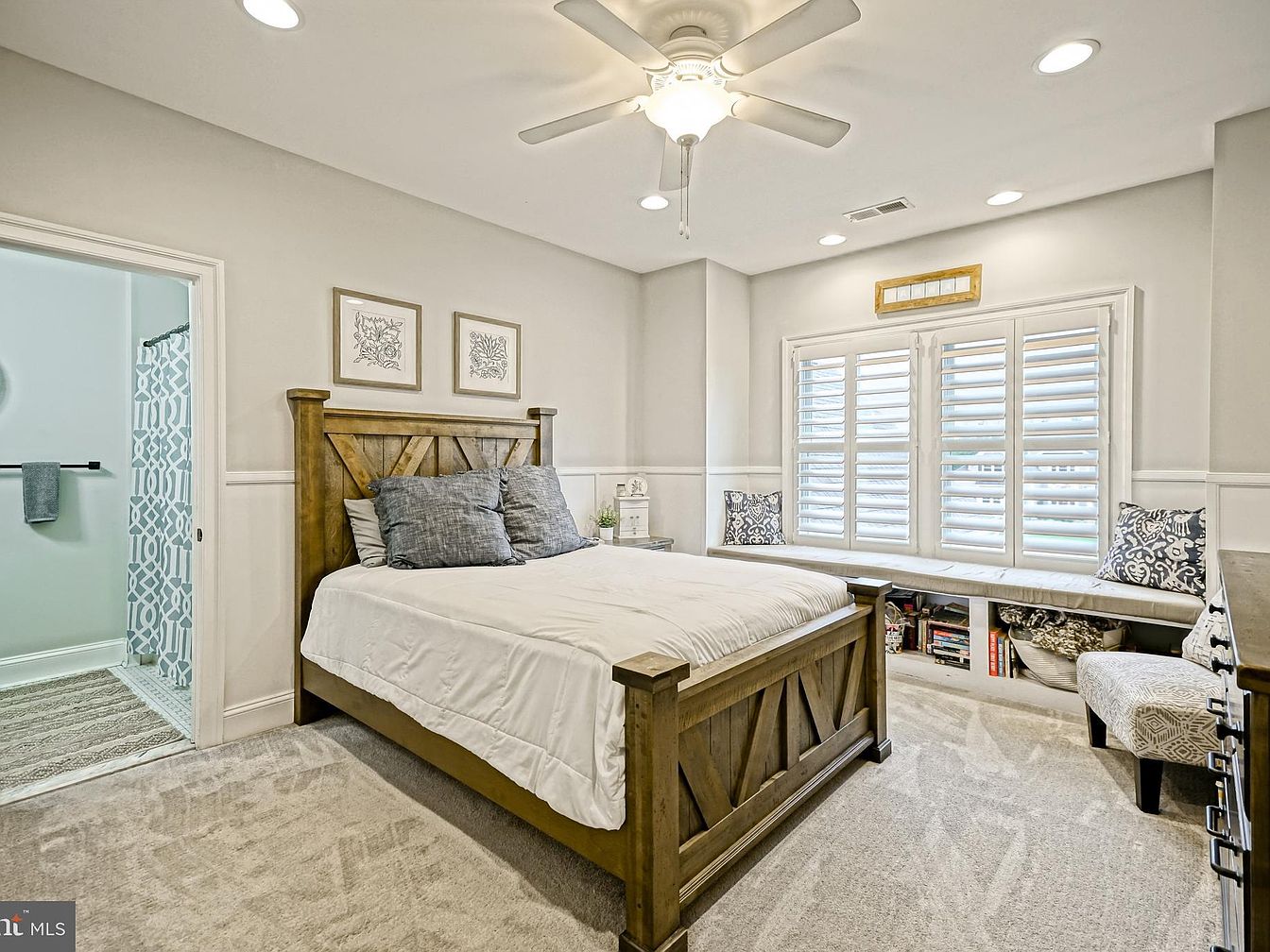 A cozy bedroom featuring a rustic wooden bed frame with a crisscross design in the headboard, adorned with plush gray pillows. The walls are painted in soft neutral tones, creating a warm atmosphere. A fan hangs from the ceiling, offering comfort in warmer months. To the side, a large window with white shutters allows natural light to fill the space, complemented by a built-in window seat with decorative cushions. A plush carpet covers the floor, enhancing comfort. Light artwork is hung above the bed, adding subtle design details, while an open doorway leads into a bathroom area.