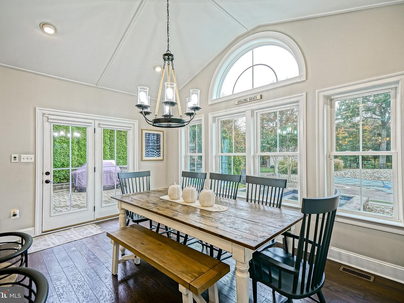 This dining area showcases a rustic wooden table paired with black spindle-back chairs, promoting a cozy, inviting atmosphere. The table is flanked by a simple wooden bench, enhancing the casual yet elegant vibe. A contemporary chandelier hangs from the vaulted ceiling, casting warm light across the space. Walls are adorned in soft neutral tones, complementing the rich, dark hardwood flooring. Large, multi-paned windows provide ample natural light and offer views of a lush, green outdoor space. French doors open up to a charming patio area, seamlessly blending indoor and outdoor living.