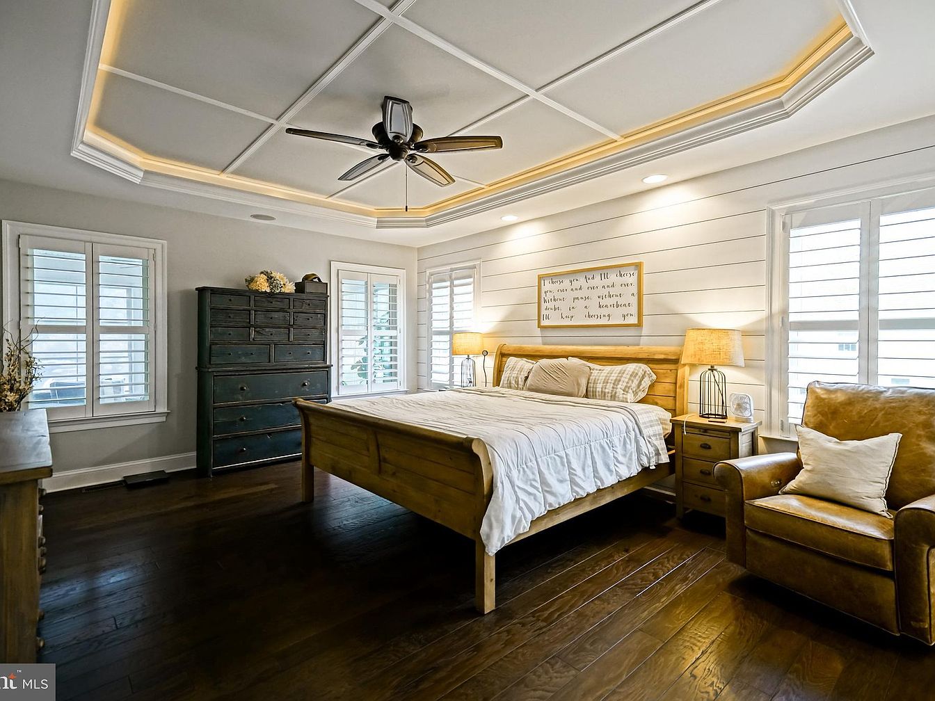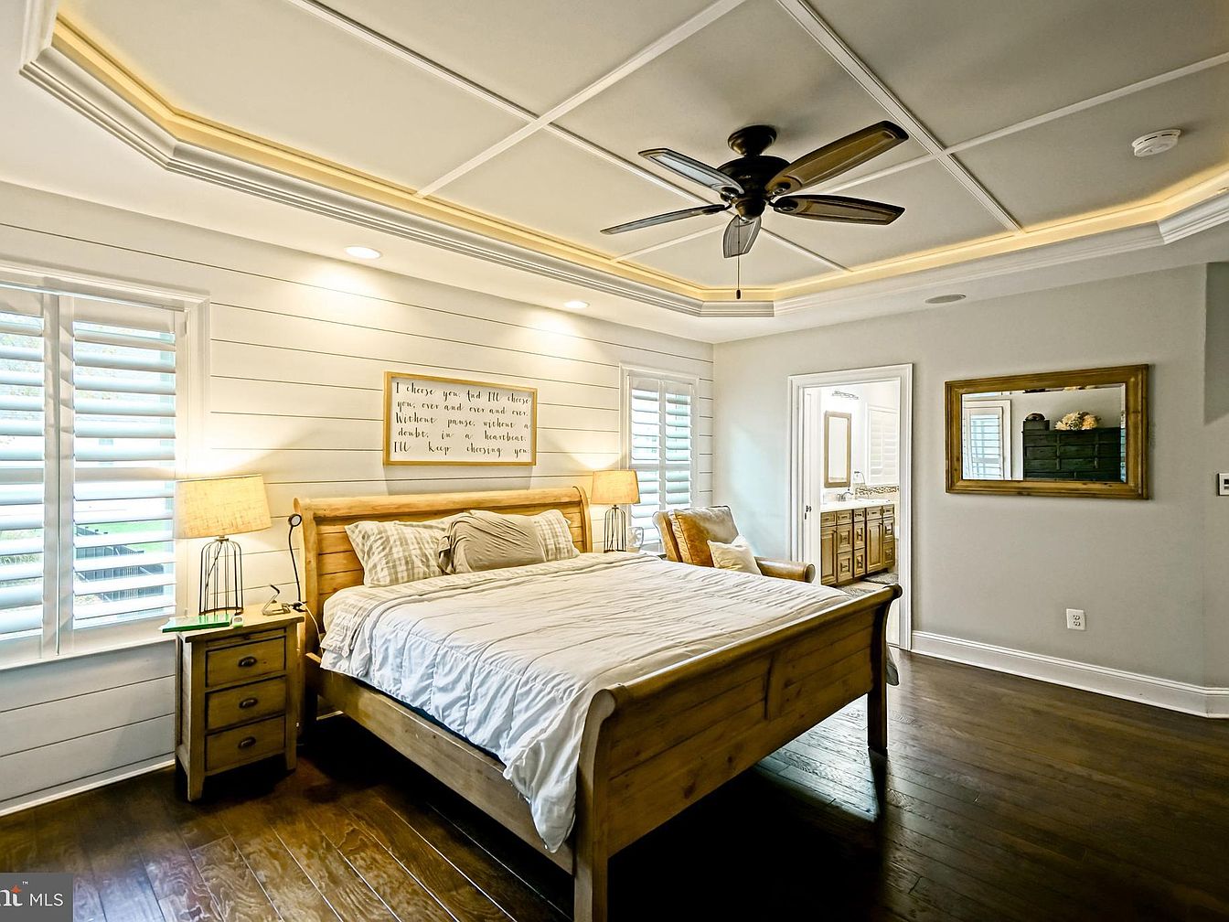 This bedroom features a cozy wooden bed frame with a light-colored bedding set, exuding warmth. The walls are adorned with white shiplap, complemented by a custom coffered ceiling with soft, recessed lighting that creates a serene atmosphere. A pair of stylish lamps flank the bed, adding a touch of elegance. Natural light streams through partially opened plantation shutters, enhancing the inviting ambiance. In the corner, a comfortable armchair paired with soft pillows provides a perfect reading nook. The rich, dark hardwood floors contrast beautifully with the light color palette, contributing to a harmonious and restful space.