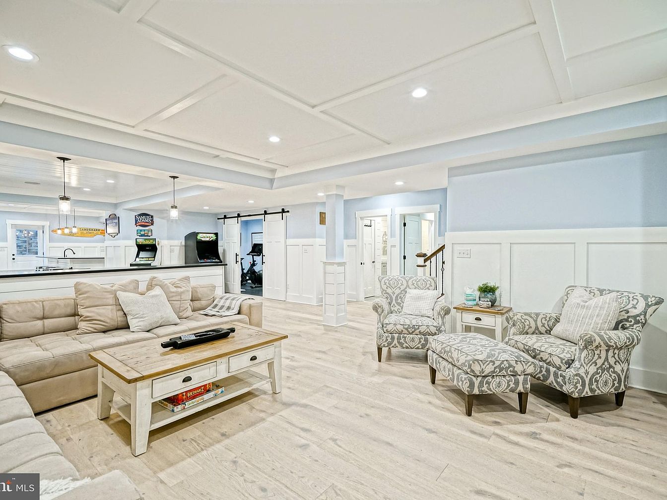 This inviting family room features a light, airy atmosphere accentuated by pale blue walls and white wainscoting. A spacious sectional sofa in a soft beige complements a rustic wooden coffee table, while decorative pillows add comfort. Two patterned armchairs provide additional seating, paired with an ottoman for relaxation. The open layout flows seamlessly into an adjacent kitchen area, highlighted by retro arcade machines that evoke nostalgia. Recessed lighting and stylish pendant fixtures enhance the room’s ambiance. Natural wood flooring adds warmth, blending contemporary and classic design elements for a cozy yet modern gathering space.