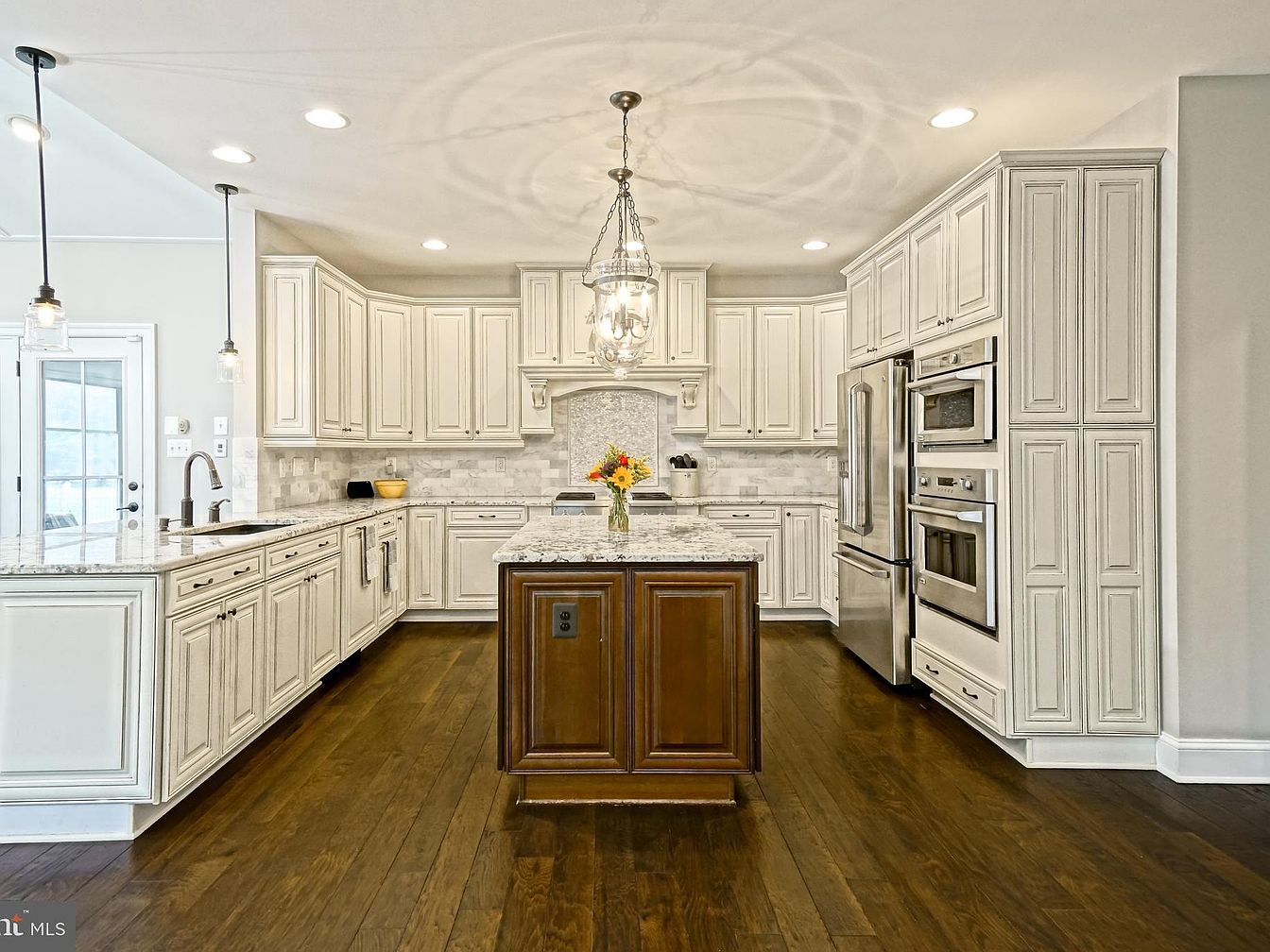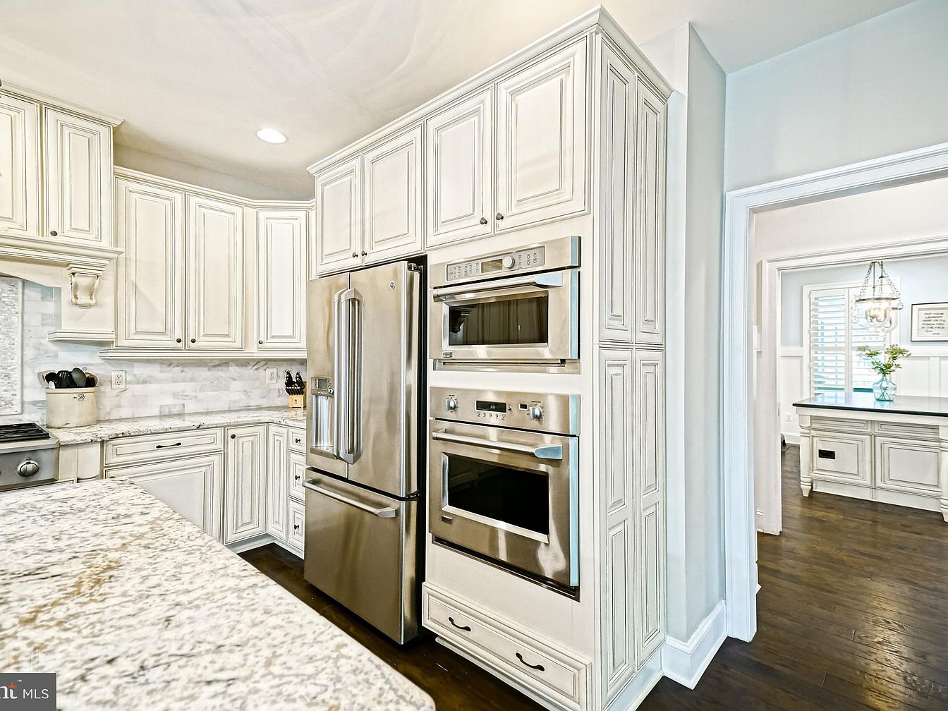 This kitchen features an elegant design with white cabinets and detailed woodwork. The cabinetry showcases a classic look with raised panels and decorative molding, complementing the speckled granite countertops. Stainless steel appliances, including a fridge and double ovens, add a modern touch, enhancing functionality while blending seamlessly with the cabinetry. A subtle marble backsplash creates visual interest against the cabinetry. Rich, dark hardwood floors provide a warm contrast against the light colors, adding depth to the space. An open layout invites natural light, with a glimpse of the adjacent room visible through an arched opening, enhancing connectivity.