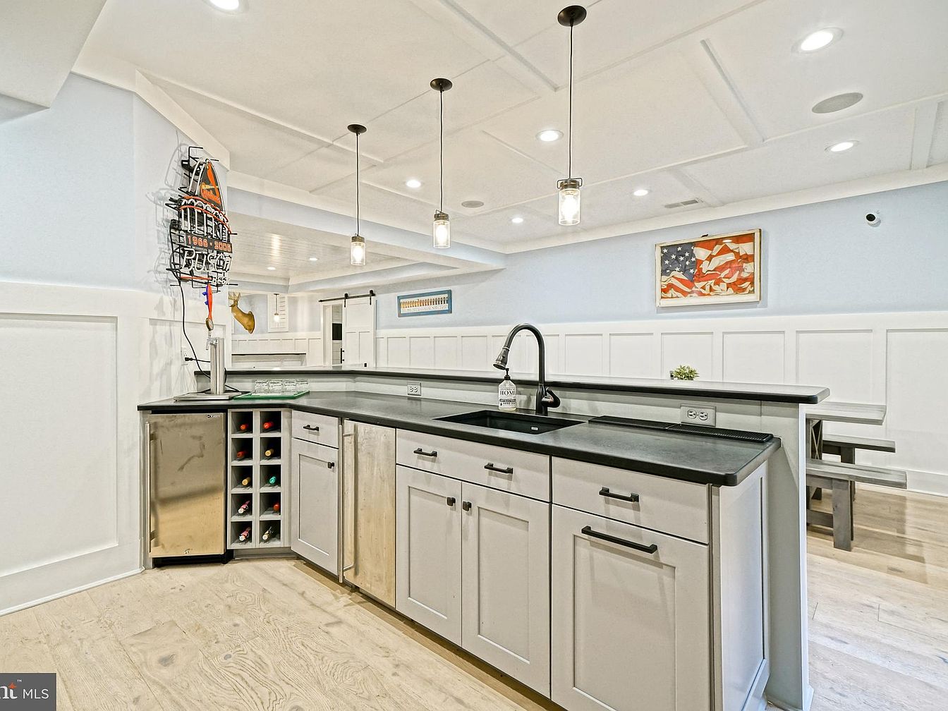 This basement bar features a sleek black countertop contrasting with light gray cabinetry. Stylish, modern pendant lights hang above, illuminating the workspace. A stainless steel mini-fridge and a wine rack store drinks underneath the counter. The surrounding walls display a crisp white wainscotting that adds elegance, while soft blue paint lends a calming atmosphere. An American flag artwork adds a touch of patriotism to one wall, enhancing the inviting vibe. A large table area can be seen in the background, complementing the layout for social gatherings, making this space perfect for entertaining friends and family.