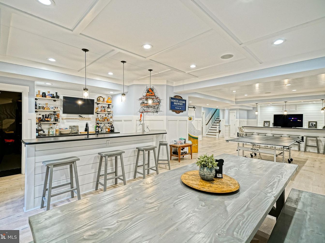 This space is a multifaceted game room featuring a modern yet inviting atmosphere. Light walls and a coffered ceiling enhance the openness, while recessed lighting adds warmth. The bar area showcases a long, dark countertop with slim gray stools. Behind the bar, open shelving displays an array of spirits and decor items, emphasizing casual elegance. A large, rustic table is centrally positioned, perfect for gatherings. A ping pong table occupies a corner, promoting active leisure. The flooring, resembling pale wood, complements the overall light color scheme, making the room feel airy and contemporary.