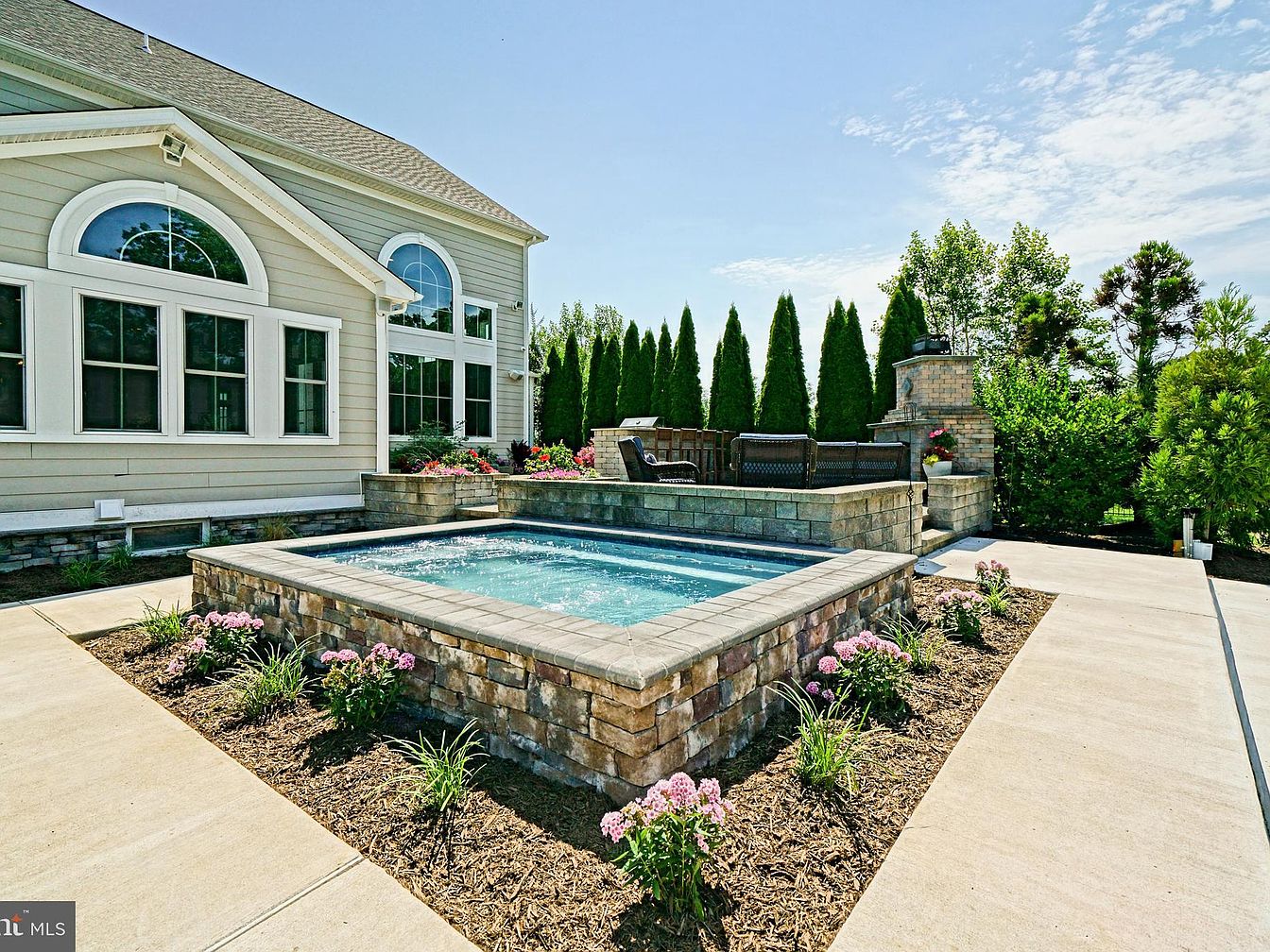 This image showcases a serene backyard retreat featuring a composite spa surrounded by stonework. The spa sits centrally, framed by lush greenery and colorful flowers, specifically pink blooms, which add vibrancy to the outdoor area. The house’s exterior, painted in soft beige, complements the natural stone of the spa’s edging. Light filters through large, arched windows, enhancing the inviting atmosphere. A patio area with comfortable seating invites relaxation, while tall evergreen trees in the background offer privacy and shade. The overall aesthetic emphasizes tranquility with harmonious colors and a well-maintained landscape, ideal for leisure.
