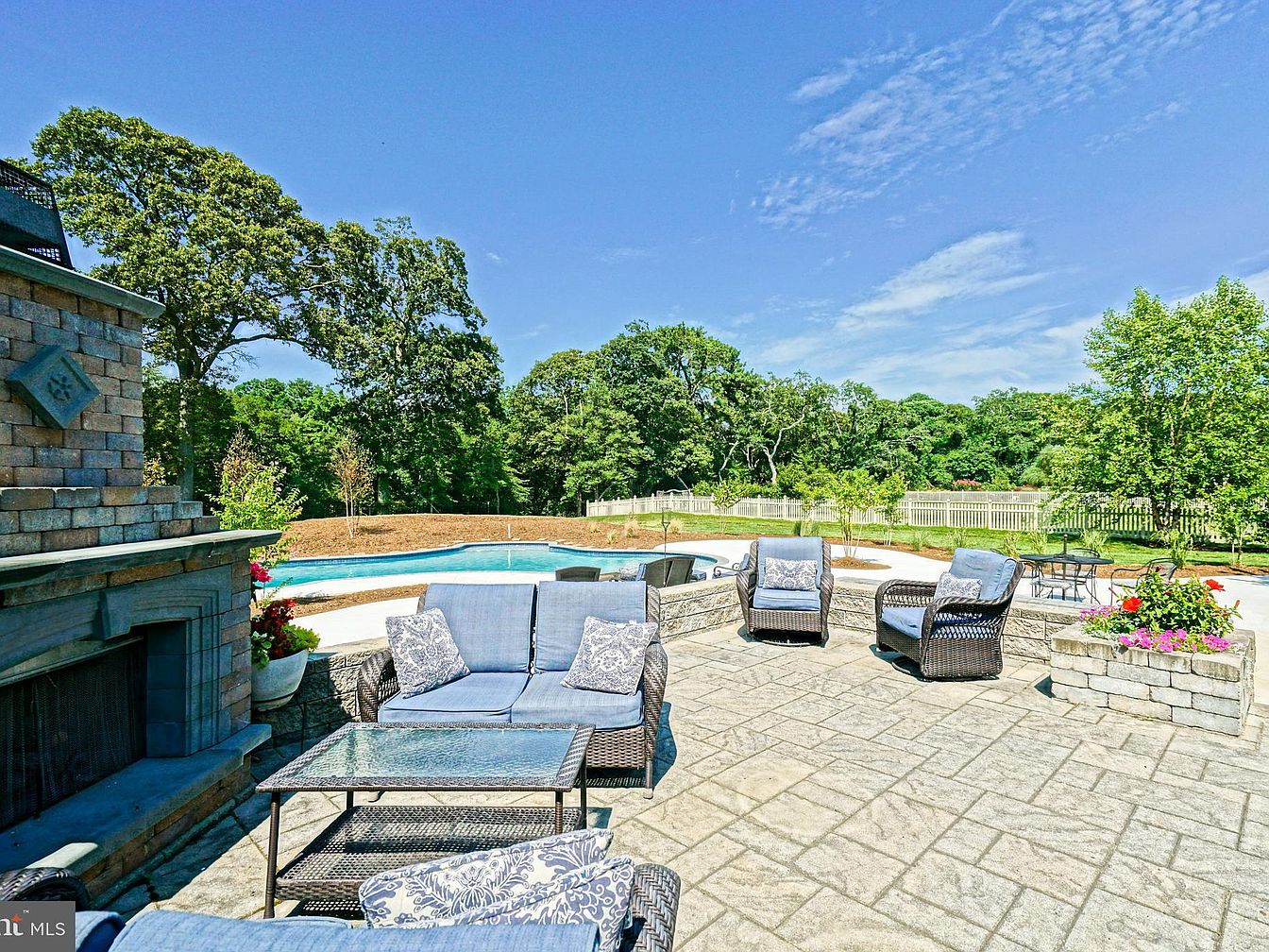 A spacious poolside patio showcases a blend of relaxation and utility. Soft gray wicker furniture with plush cushions in a muted blue complements the stone paver flooring. A small coffee table, glass-topped, offers a practical surface for drinks. Surrounding the area, vibrant flowers in stone planters add a pop of color against the neutral stone backdrop. The large, inviting swimming pool glistens under bright blue skies, enhancing the tranquil atmosphere. Lush green trees and a well-maintained fenced yard provide privacy and a natural setting, ideal for outdoor gatherings and leisurely afternoons in the sun.