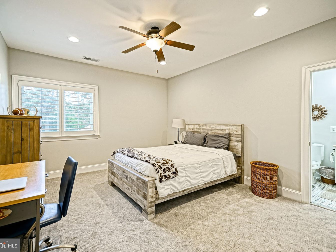 This cozy bedroom features a spacious layout with a soft, neutral color palette that enhances a calming atmosphere. A king-sized bed with a rustic wooden frame is dressed in white bedding accented by dark throw pillows. Nearby, a sleek desk chair complements the simple wooden desk, creating an inviting workspace. Natural light floods the room through plantation shutters on a large window, while a stylish ceiling fan adds functionality and aesthetic appeal. A woven basket adds a touch of warmth, contrasting nicely with the pale carpeting and highlighting the room’s thoughtful design that balances comfort and style.
