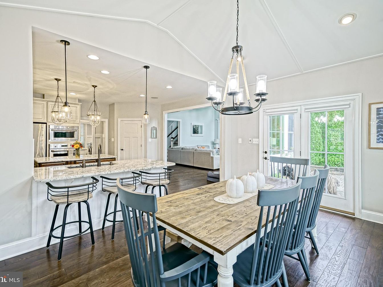 This dining area features a rustic wooden table paired with stylish blue spindle-back chairs, creating a charming contrast. Overhead, a modern chandelier with glass shades adds a contemporary touch amidst a soft color palette of light grays and whites. The adjoining kitchen area showcases a sleek granite countertop with modern bar stools, further enhancing the open layout. Natural light filters through French doors, illuminating the space and offering a view of the lush outdoor garden. The polished hardwood floor complements the overall aesthetic, merging comfort and elegance while inviting intimate gatherings.