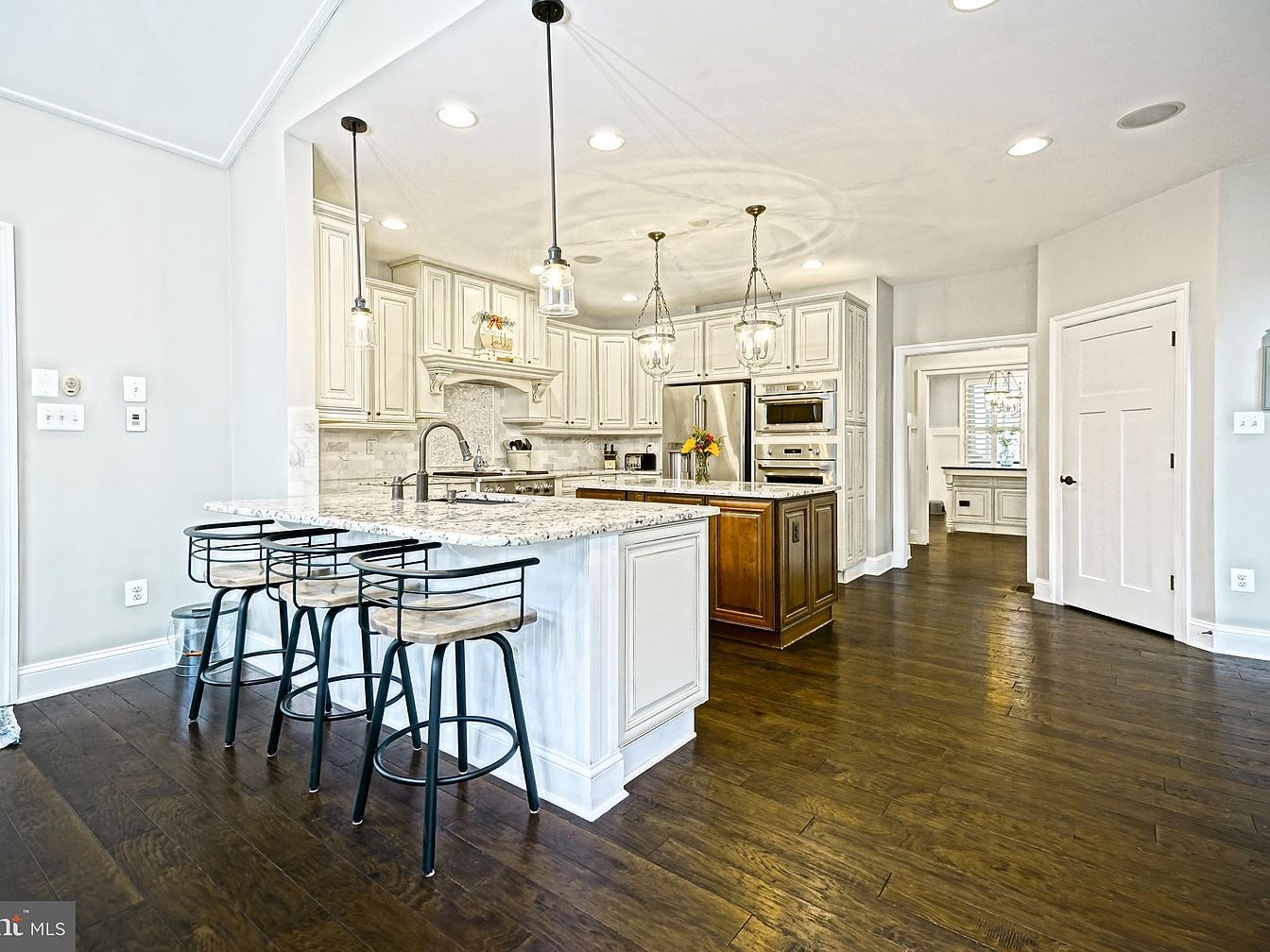 The kitchen features a spacious layout dominated by light cabinetry and a large granite island. Three modern stools with wooden seats and black metal frames line the island, providing a casual dining area. Sleek appliances are seamlessly integrated into the cabinetry, emphasizing a clean aesthetic. The color scheme includes soft whites and earthy wood tones, enhancing warmth. Pendant lighting hangs above the island, casting soft illumination. Dark hardwood floors contrast beautifully with the lighter cabinetry, while subtle architectural details, such as crown molding and smooth countertops, add elegance to the space, creating a welcoming and functional environment.