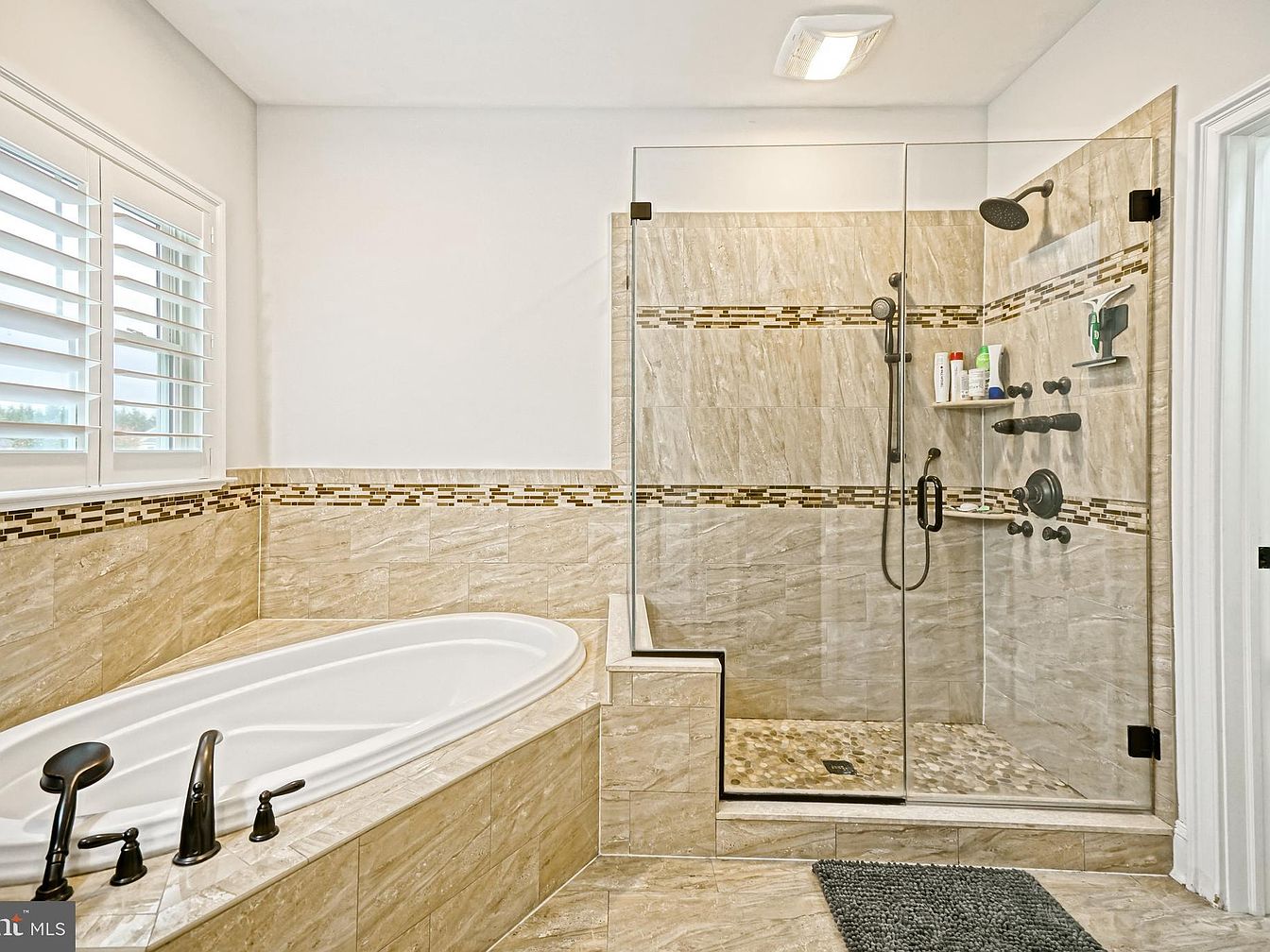 This modern bathroom features a luxurious layout with a spacious freestanding tub adjacent to a glass-enclosed shower. The tub is elegantly designed with a curved edge and sleek black faucet, enhancing the contemporary feel. Textured tiles in neutral beige tones cover the walls and floor, with a decorative mosaic band adding visual interest between the tub and shower area. Natural light filters in through plantation shutters, brightening the space. The shower includes a dual showerhead setup and minimalist built-in shelving. A plush gray mat lies on the floor, adding comfort and warmth to the overall aesthetic.