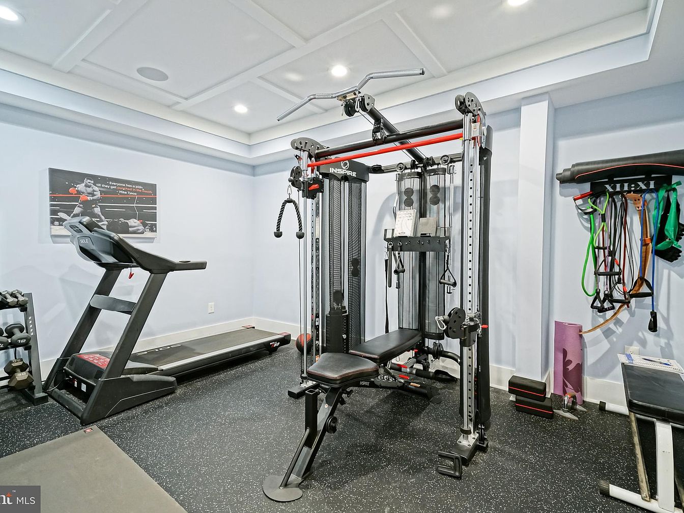 This home gym showcases a compact yet functional layout, featuring a multi-station weight machine alongside a treadmill. The walls are painted in a soothing light blue, enhancing the feeling of space, while the ceiling is adorned with elegant white paneling. Flooring consists of durable black rubber, ideal for workouts. Equipment includes colorful resistance bands neatly organized on the wall and a small set of dumbbells, providing diverse workout options. Thoughtfully placed motivational artwork inspires activity, creating an energetic atmosphere that promotes fitness and well-being. Overall, this area is designed for convenience and functionality.