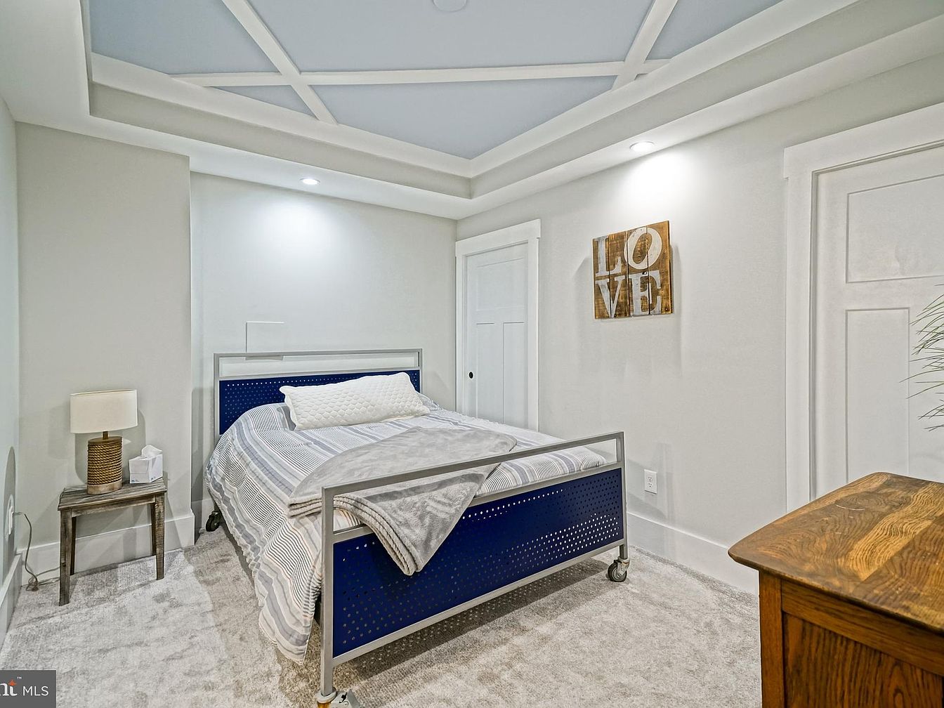 This cozy bedroom features a modern aesthetic with a minimalist design. A large, blue metal frame bed with a cushioned white pillow sits at the center, inviting relaxation. The bedspread displays a soft striped pattern in neutral tones, complementing the light gray walls and plush carpet. A sleek, round nightstand with a simple lamp provides functional lighting, while a wooden chest adds natural warmth. Above the bed, a wooden sign reads ‘LOVE,’ enhancing the room’s inviting atmosphere. The coffered ceiling painted a soft blue adds architectural interest, creating a serene and stylish sleeping environment.