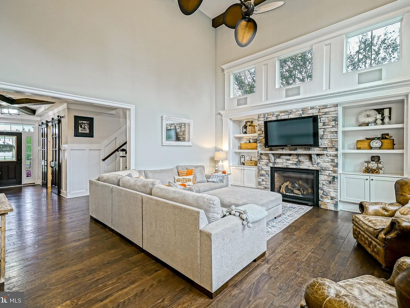 This spacious living room features a large sectional sofa in a light gray fabric, complemented by two rich brown leather armchairs. The color palette remains warm and inviting, with muted earth tones enhancing the ambiance. A prominent stone fireplace serves as the focal point, framed by custom cabinetry and a mounted television above. Large windows allow natural light to flood in, highlighting the high ceilings and rustic wooden beams. The hardwood flooring adds warmth and elegance, while a patterned rug anchors the seating area. Decorative elements like lamps, books, and art pieces add personality and charm.